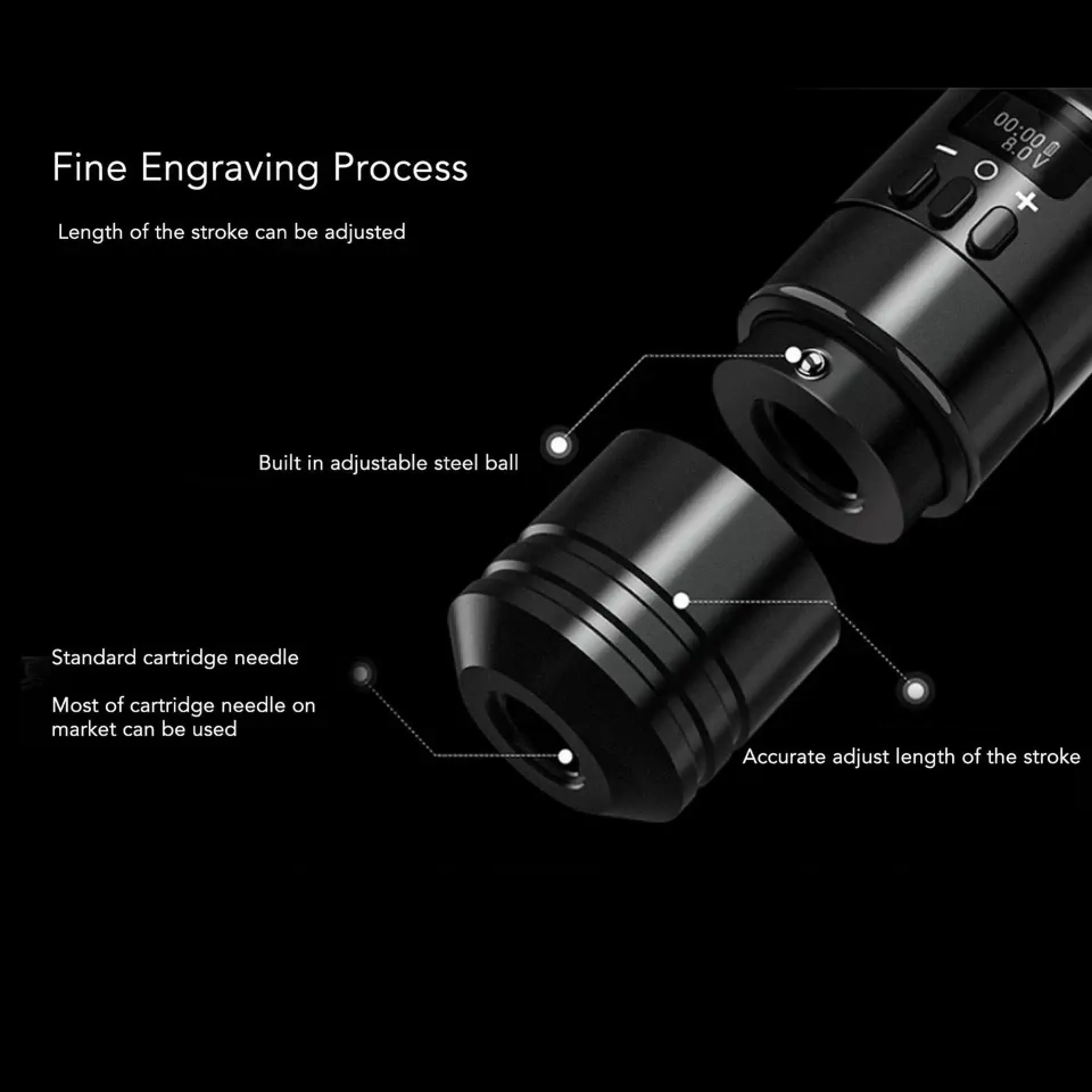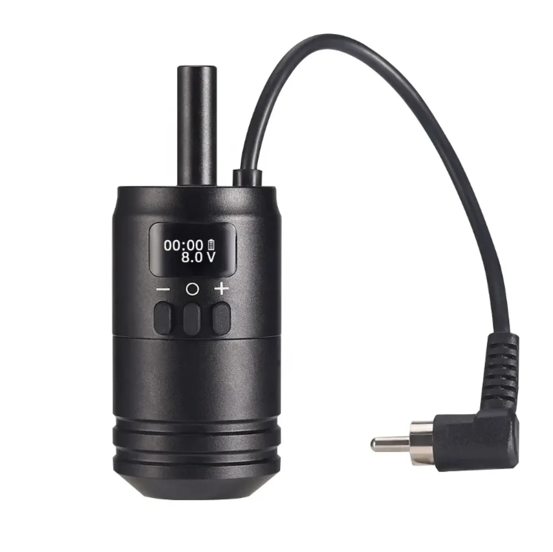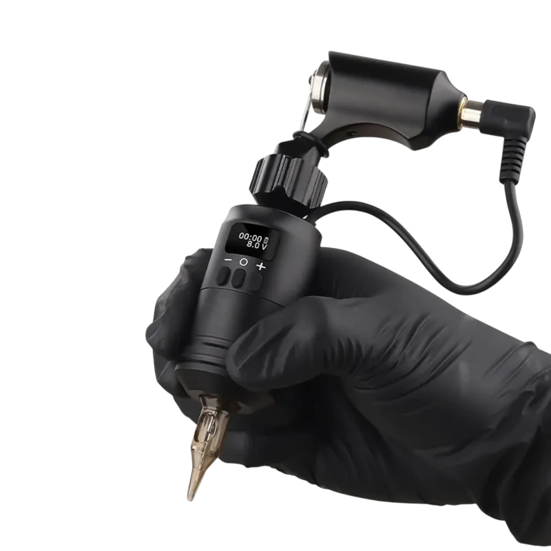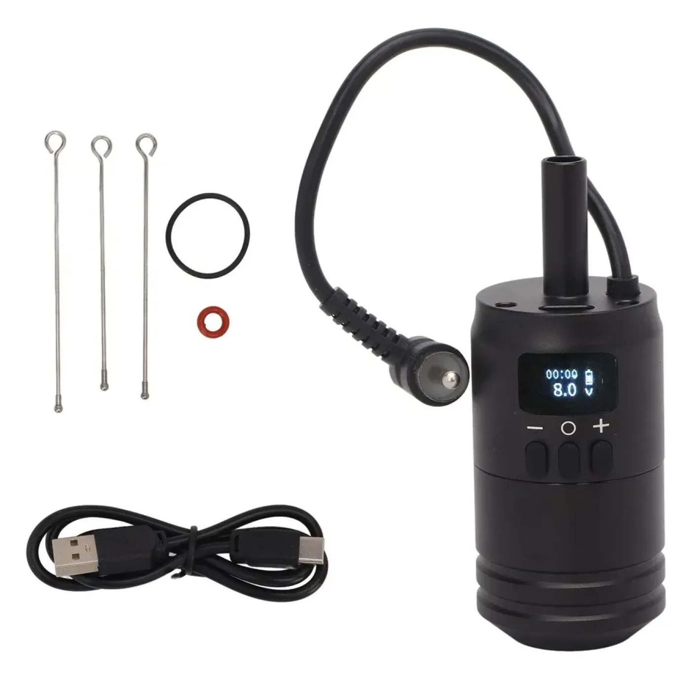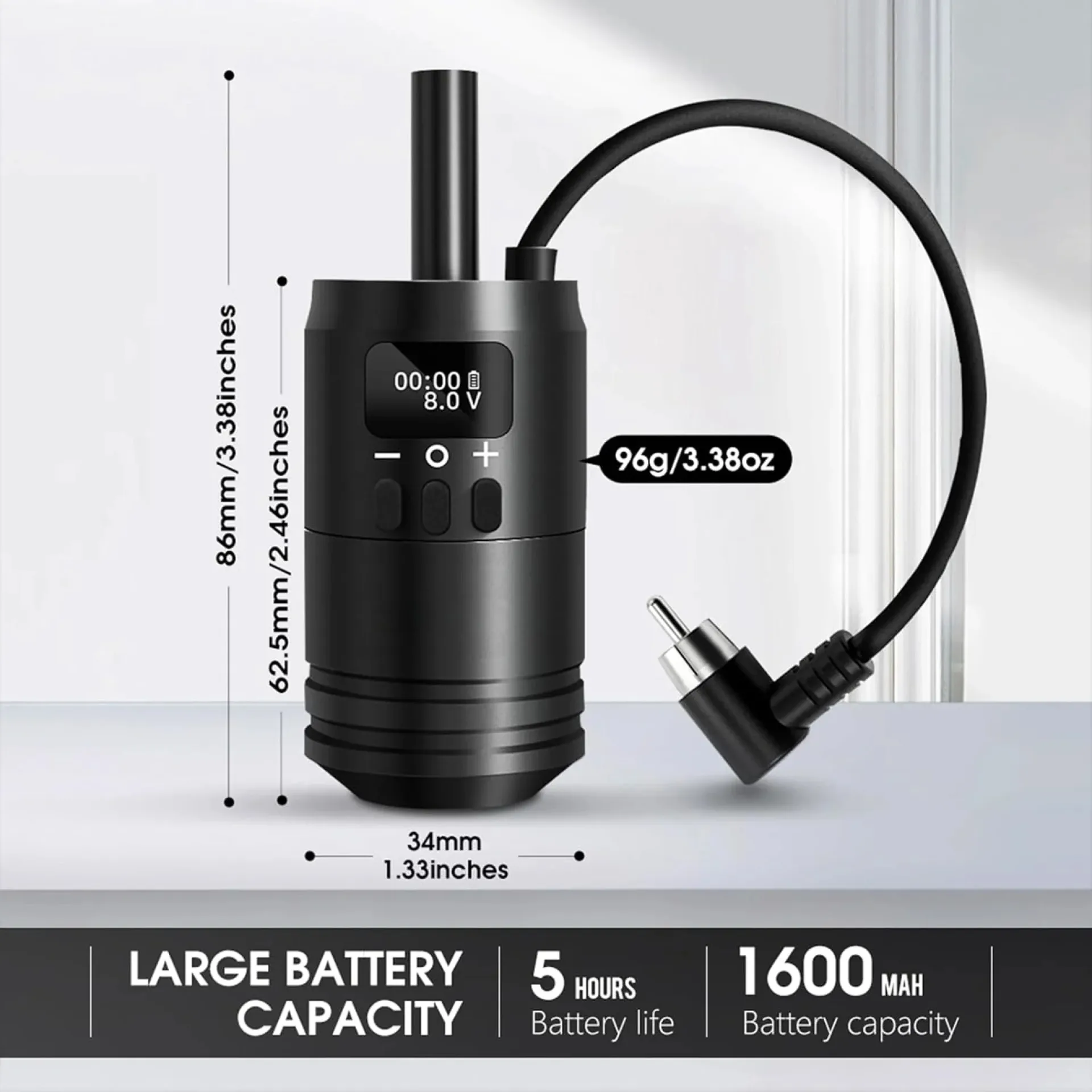 LCD дисплеят ясно показва оставащия капацитет на батерията, текущото напрежение и времето на работа. С капацитет от 1600 mAh предлага достатъчна мощност и съвместимост с повечето татуировъчни машини с RCA връзка.