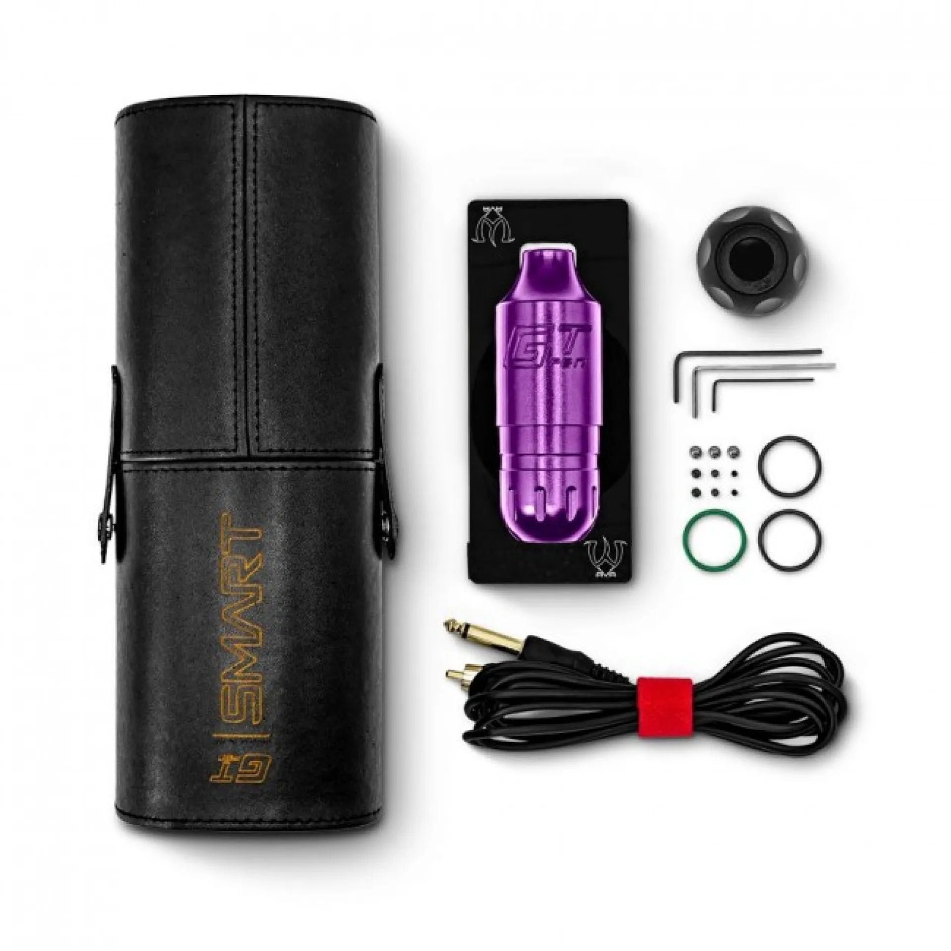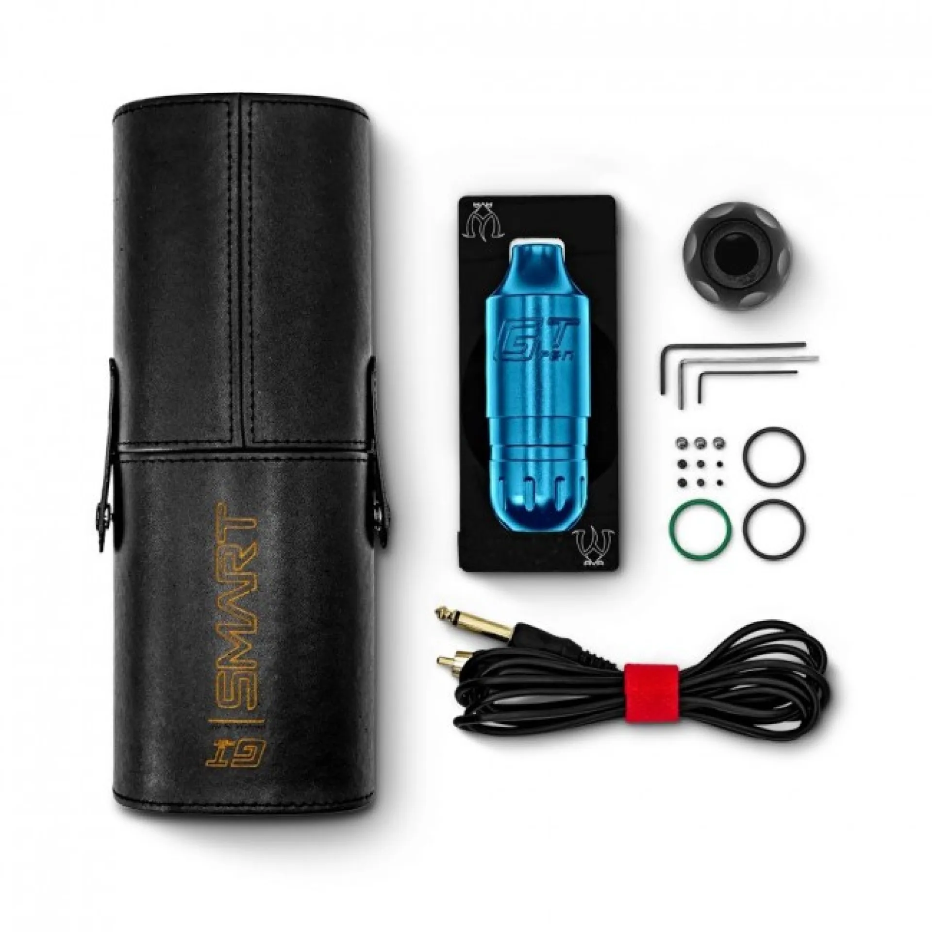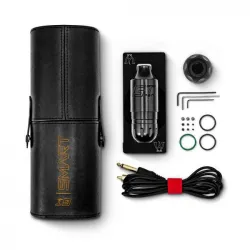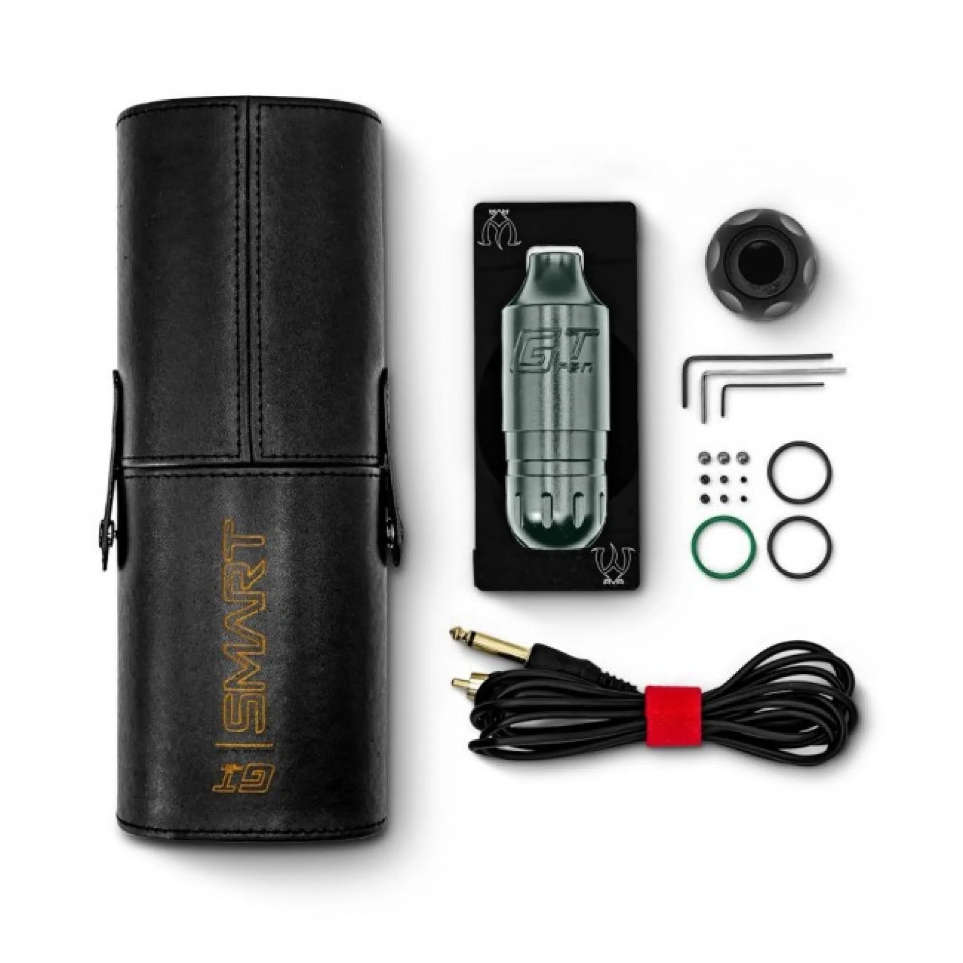 GT SMART PEN е мощна машина за татуировки, която е лека, компактна и универсална за всякакъв вид работа. Това е устройство тип PEN, но размерът му е по-скоро като ръкохватка. Дължината му е само 90 мм, така че определено ще се побере във всяка ръка. Машината се задвижва от японски мотор с височина на хода 3,5 мм. Удължението на иглата може да се коригира чрез завъртане на долния захват, докато вградената click система осигурява прецизно регулиране на удължението според нуждите. Захранването се осигурява чрез стандартен RCA конектор, а кабелът е включен в комплекта. В допълнение към кабела, ще получите и стойка за машината, резервна SLIM ръкохватка и гаранционна карта, потвърждаваща, че не е фалшификат, в луксозен кожен калъф. Производителят е включил към машината и комплект основни резервни части, като гумени уплътнения, винтове и комплект шестостенни ключове.