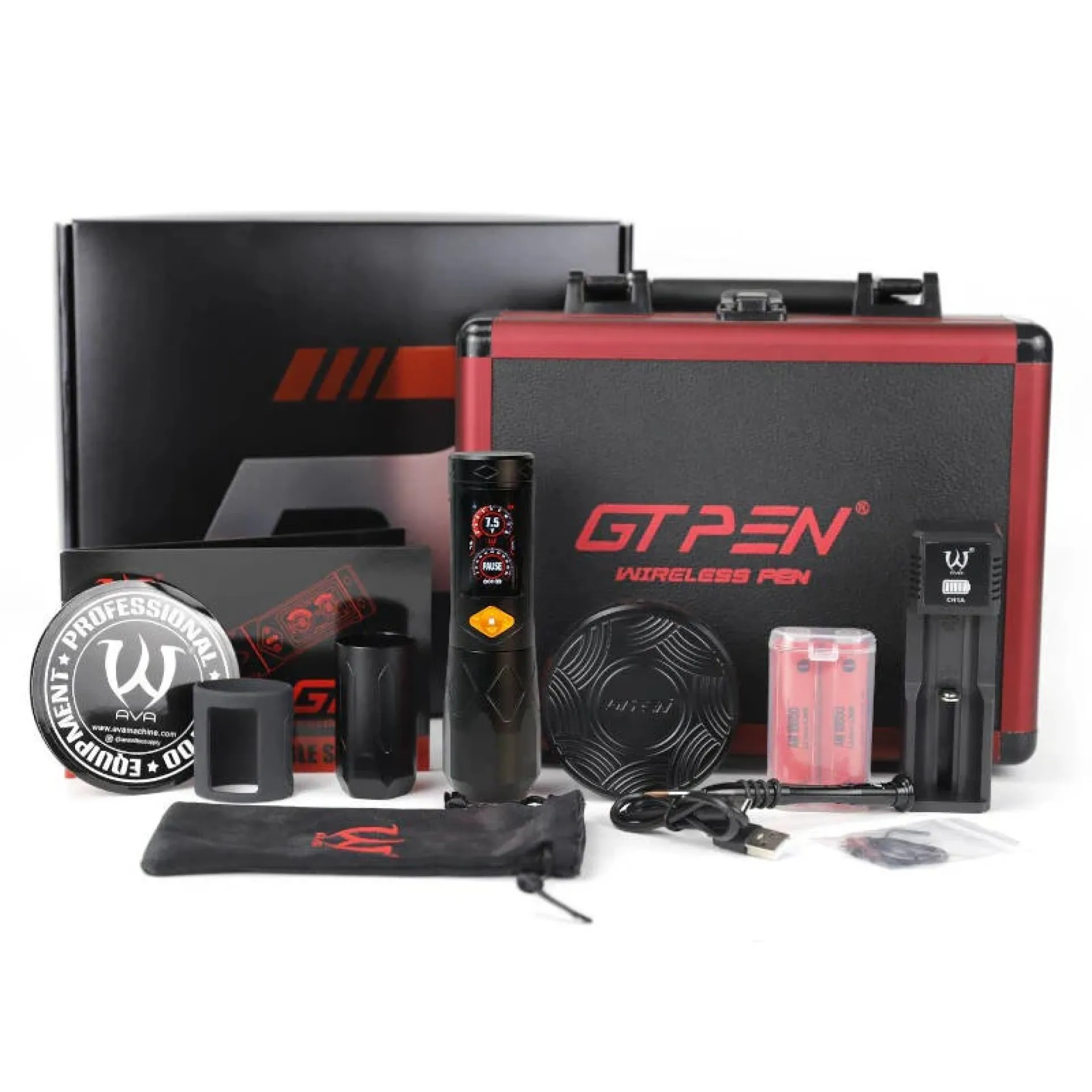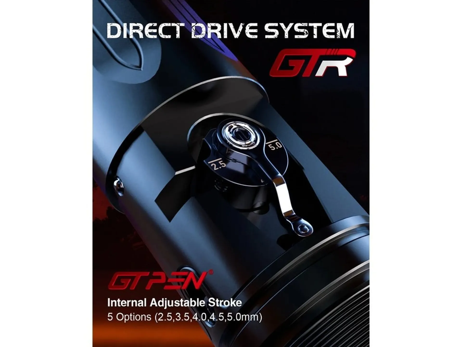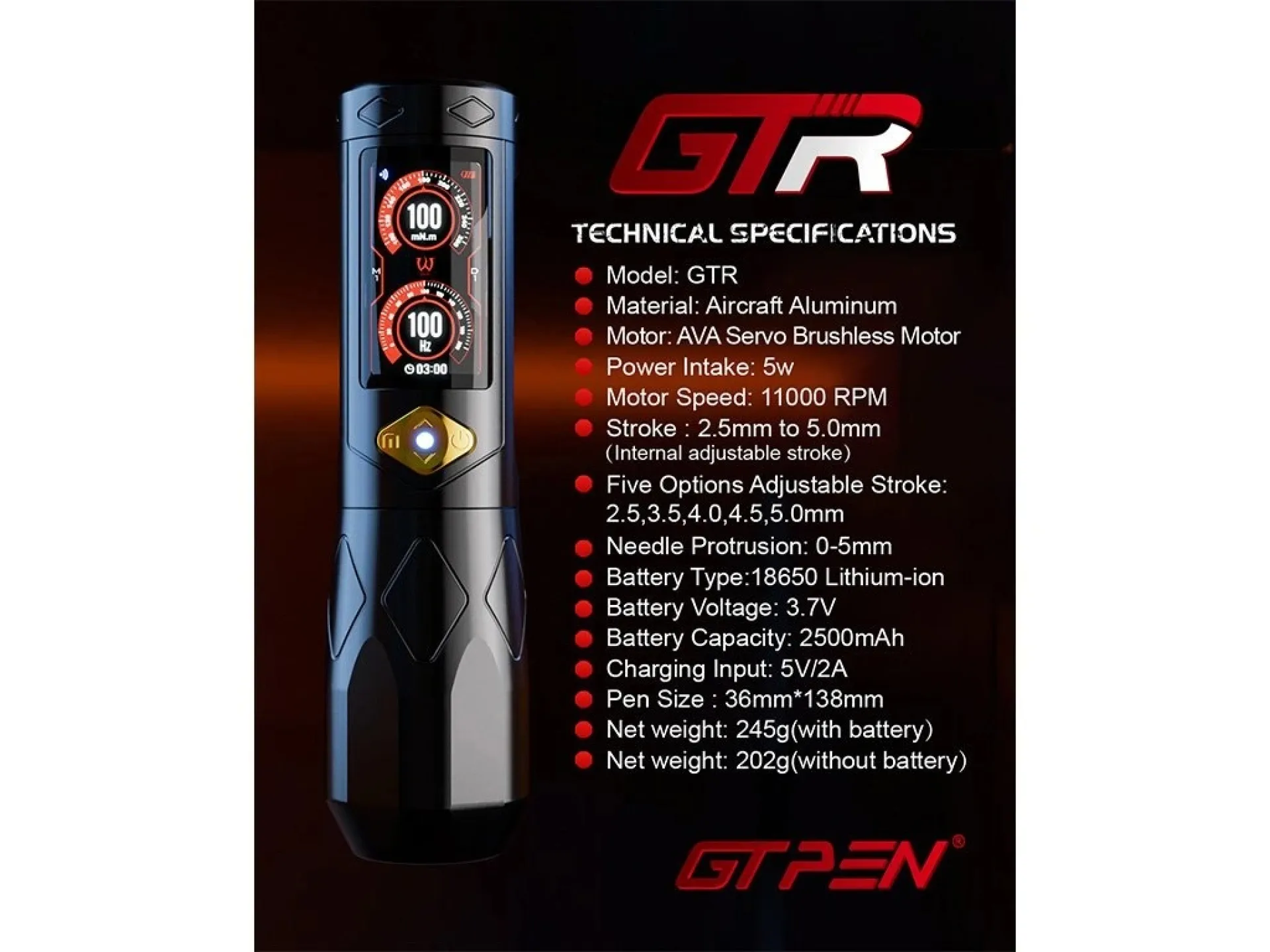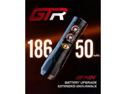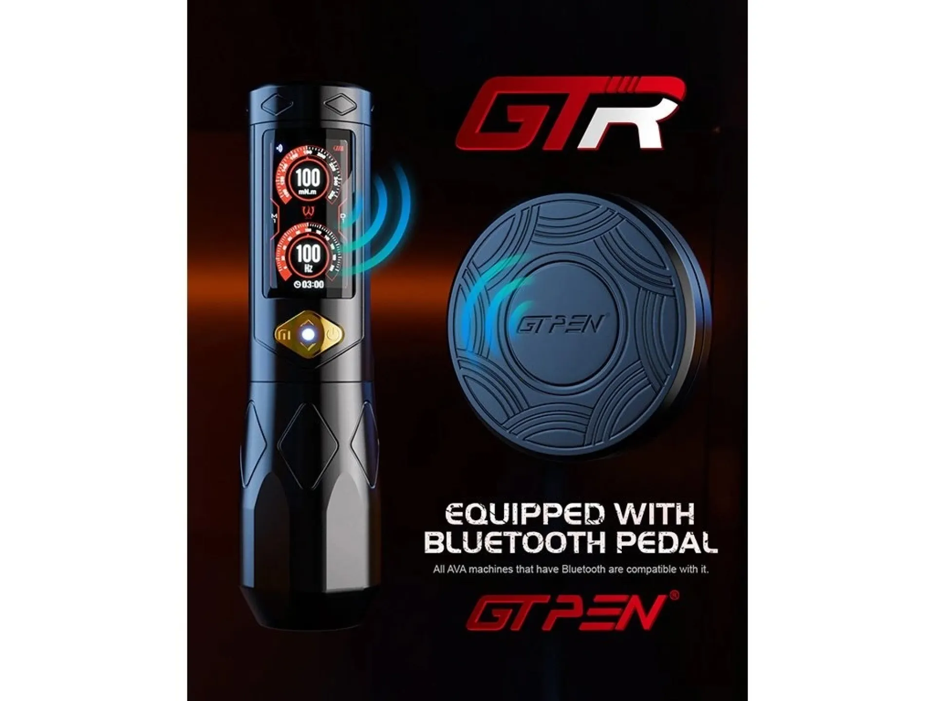 Безжичната машинка GTR от марката AVA е мултифункционална и подходяща за татуиране и SMP. Предлага се с две сменяеми литиево-йонни батерии (тип 18650) с капацитет 2500 mAh. Една батерия осигурява работа от 1,5 до 5 часа в зависимост от използваното напрежение, честота и въртящ момент. Цветният дисплей с висока резолюция показва работен режим, напрежение, честота, въртящ момент, работно време и мощност. Машинката е снабдена с нов servo безчетков мотор, който гарантира по-дълъг живот, по-ефективно използване на батерията и директна трансмисия с ниско износване. Има регулируем ход и предлага два работни режима. Режим M – нормален режим, подходящ за стандартно татуиране, и режим D – подходящ за dotwork и SMP. AVA GTR е оборудвана с безжичен педал с BLUETOOTH връзка за лесно включване и изключване с крак. Педалът е съвместим с всички тату машинки от марката AVA, които поддържат такава връзка. Регулируемият ход може да бъде настроен вътре в машинката чрез развиване на грипа с помощта на комплекта, включен в опаковката.
