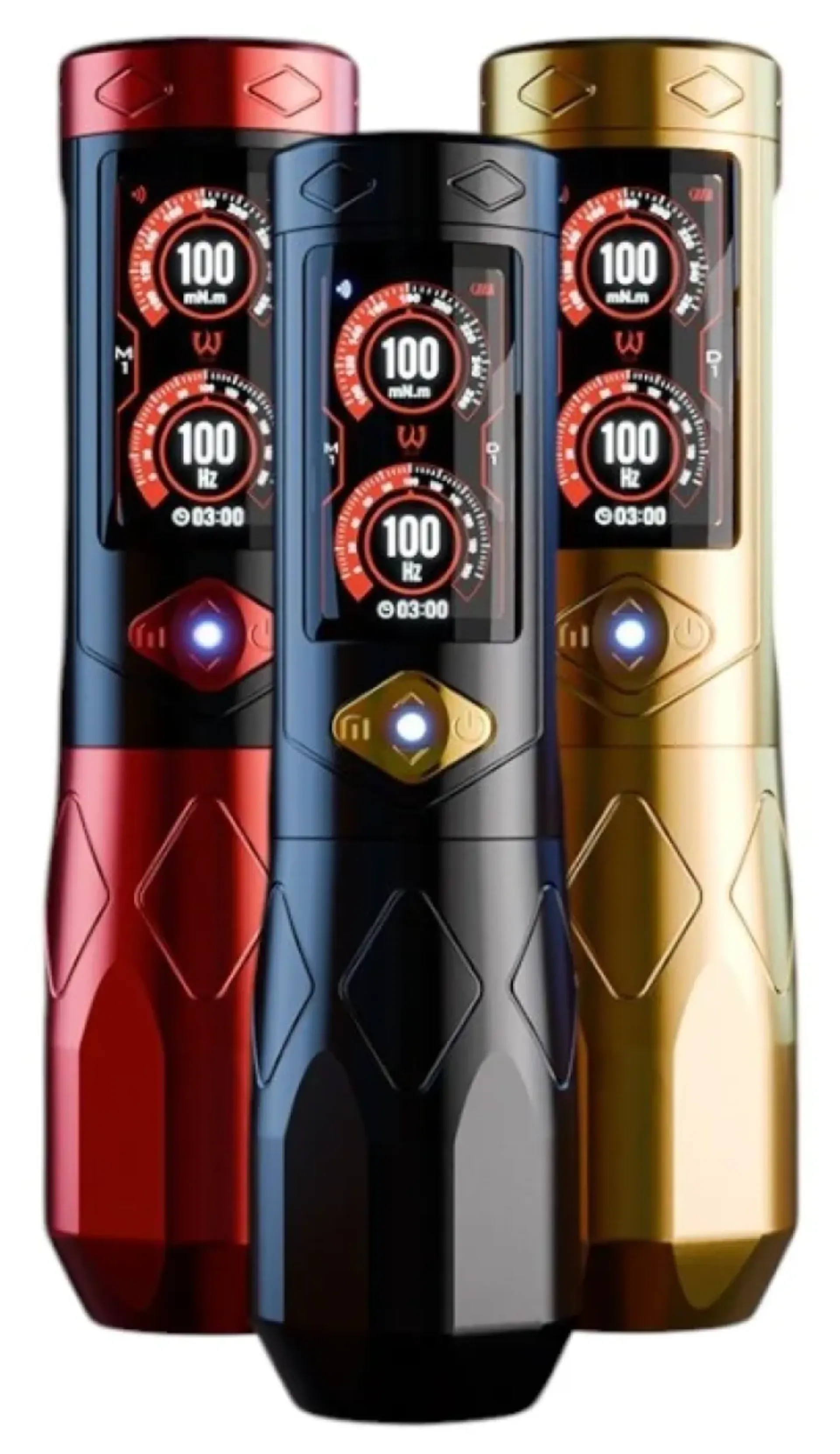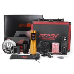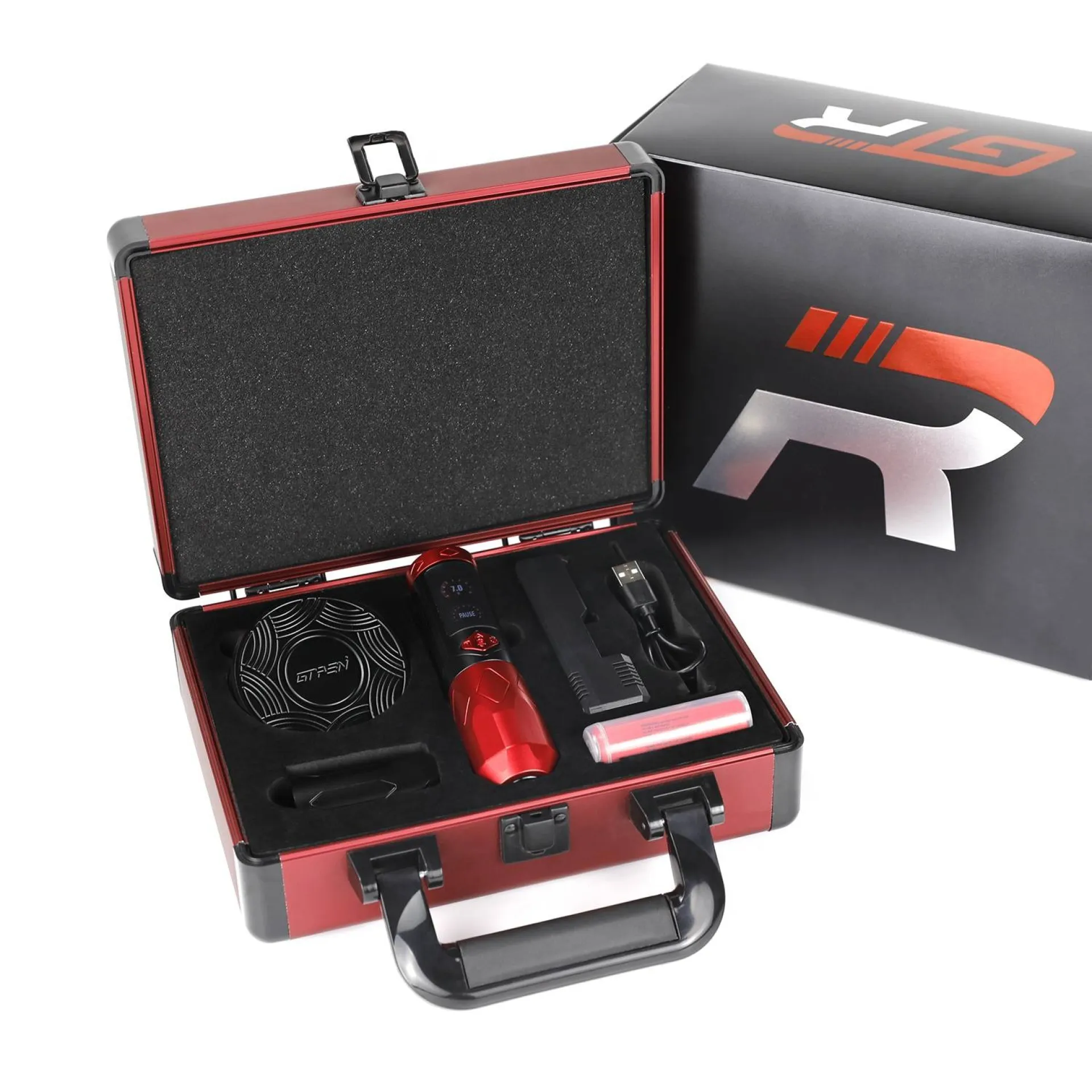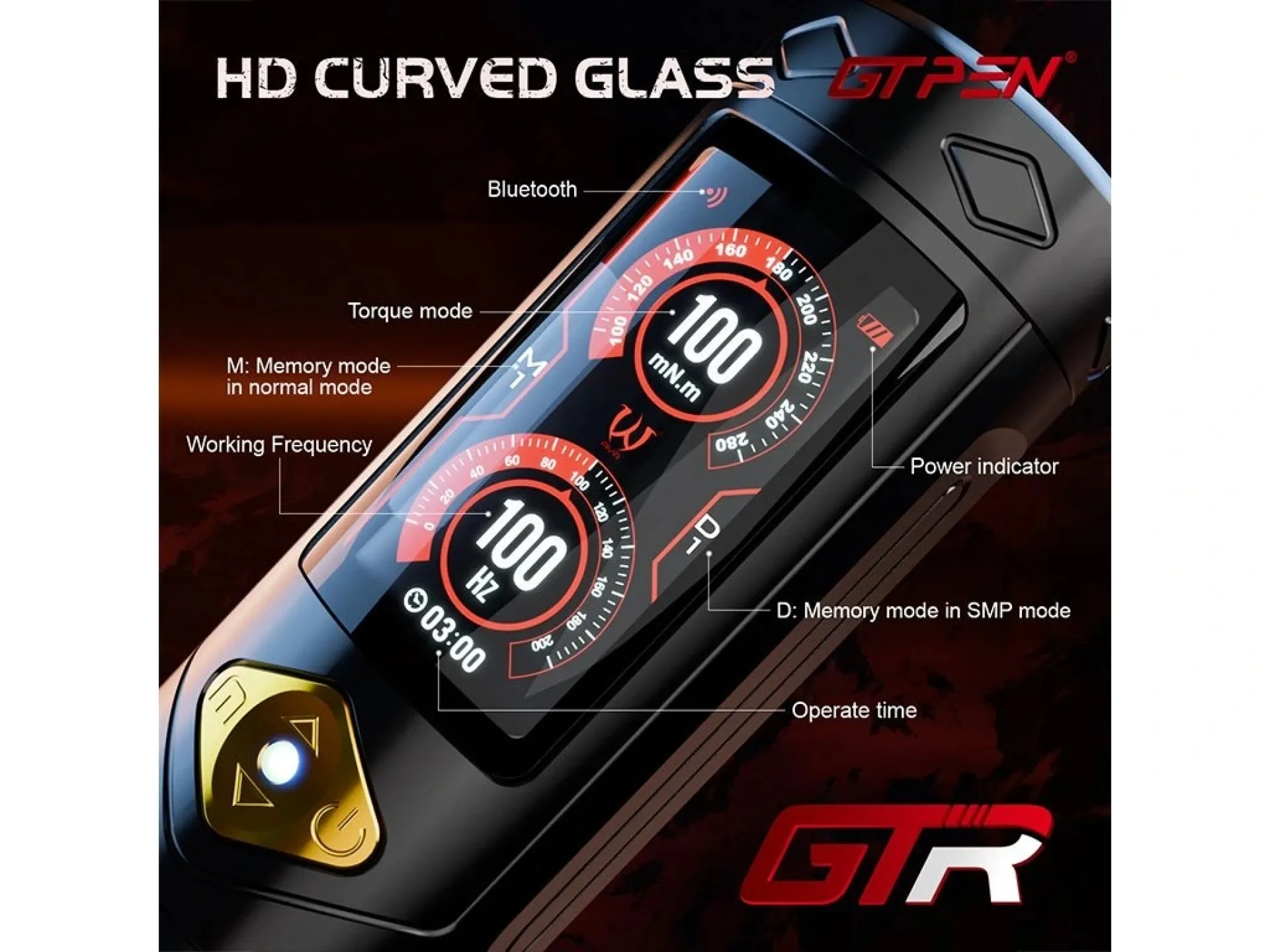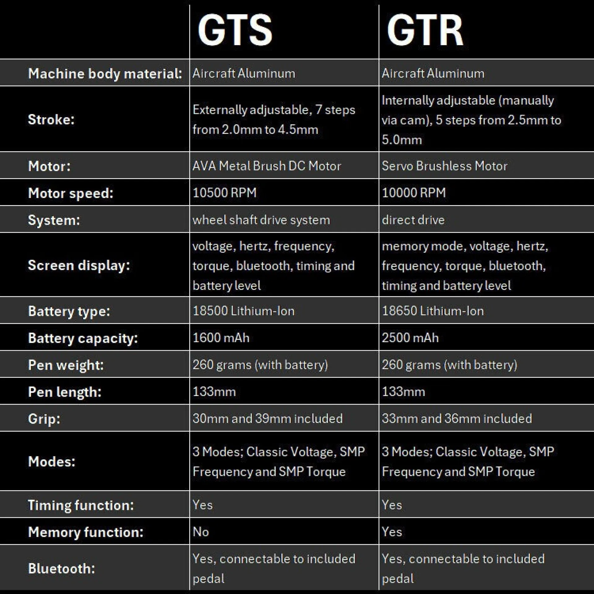 Безжичната машинка GTR от марката AVA е мултифункционална и подходяща за татуиране и SMP. Предлага се с две сменяеми литиево-йонни батерии (тип 18650) с капацитет 2500 mAh. Една батерия осигурява работа от 1,5 до 5 часа в зависимост от използваното напрежение, честота и въртящ момент. Цветният дисплей с висока резолюция показва работен режим, напрежение, честота, въртящ момент, работно време и мощност. Машинката е снабдена с нов servo безчетков мотор, който гарантира по-дълъг живот, по-ефективно използване на батерията и директна трансмисия с ниско износване. Има регулируем ход и предлага два работни режима. Режим M – нормален режим, подходящ за стандартно татуиране, и режим D – подходящ за dotwork и SMP. AVA GTR е оборудвана с безжичен педал с BLUETOOTH връзка за лесно включване и изключване с крак. Педалът е съвместим с всички тату машинки от марката AVA, които поддържат такава връзка. Регулируемият ход може да бъде настроен вътре в машинката чрез развиване на грипа с помощта на комплекта, включен в опаковката.