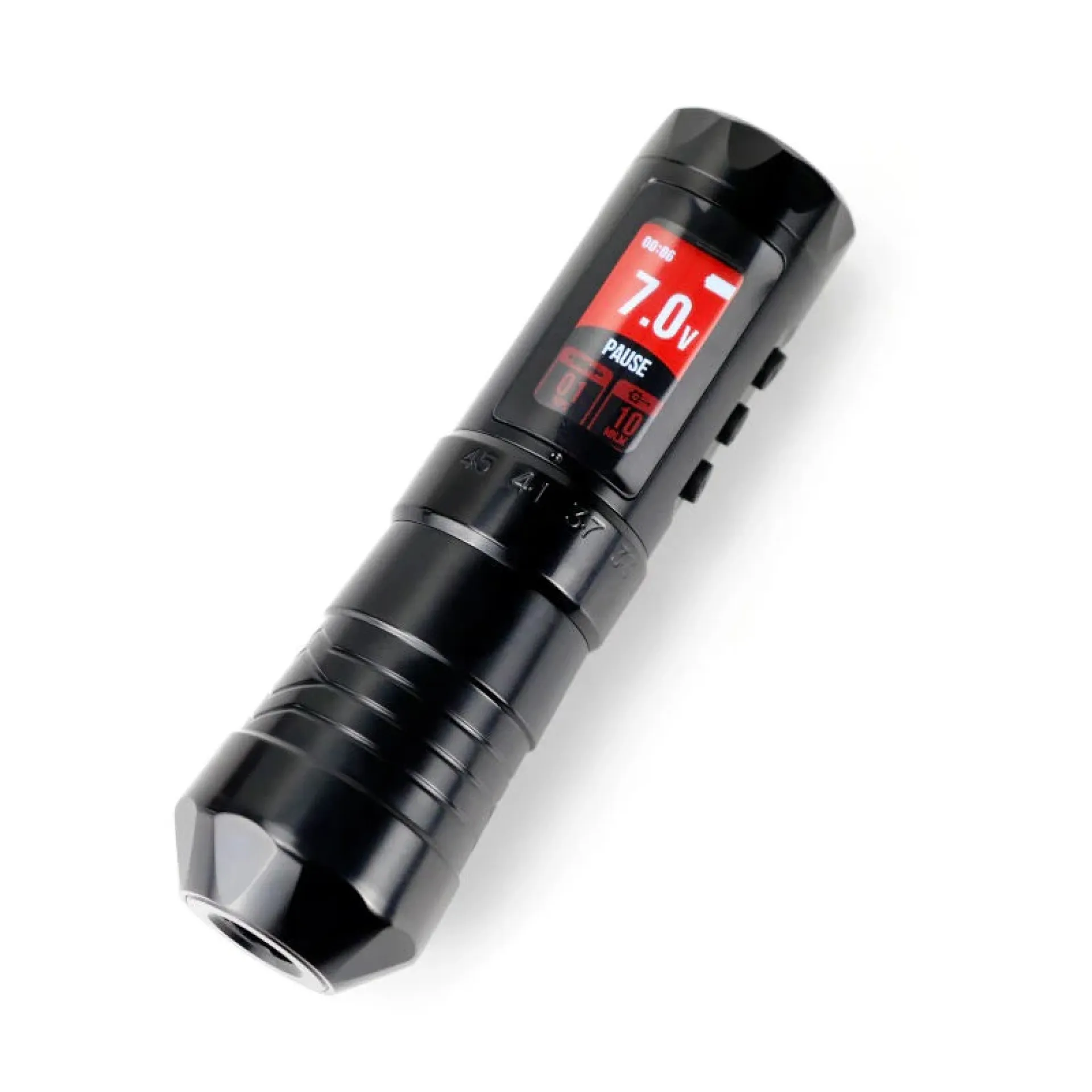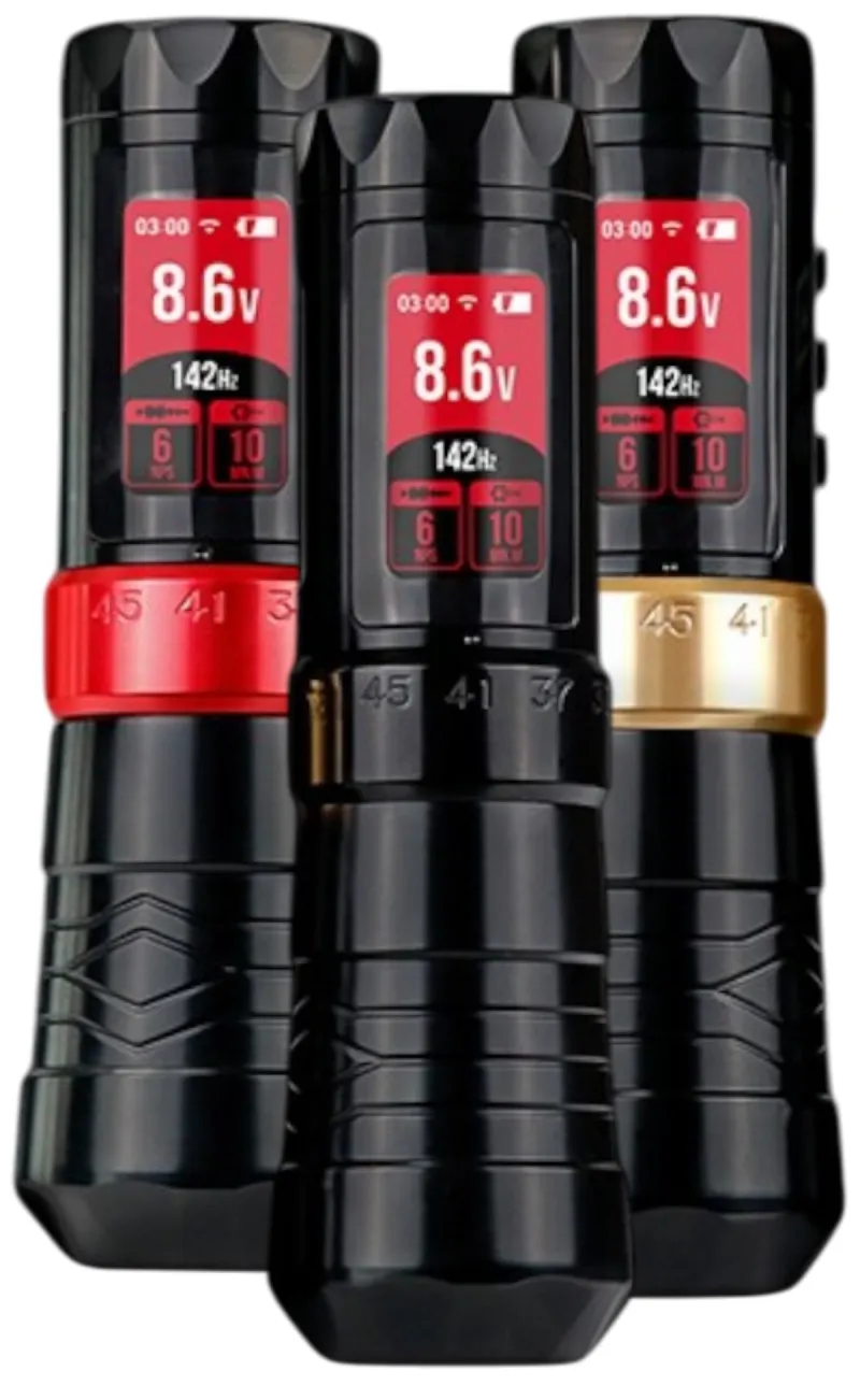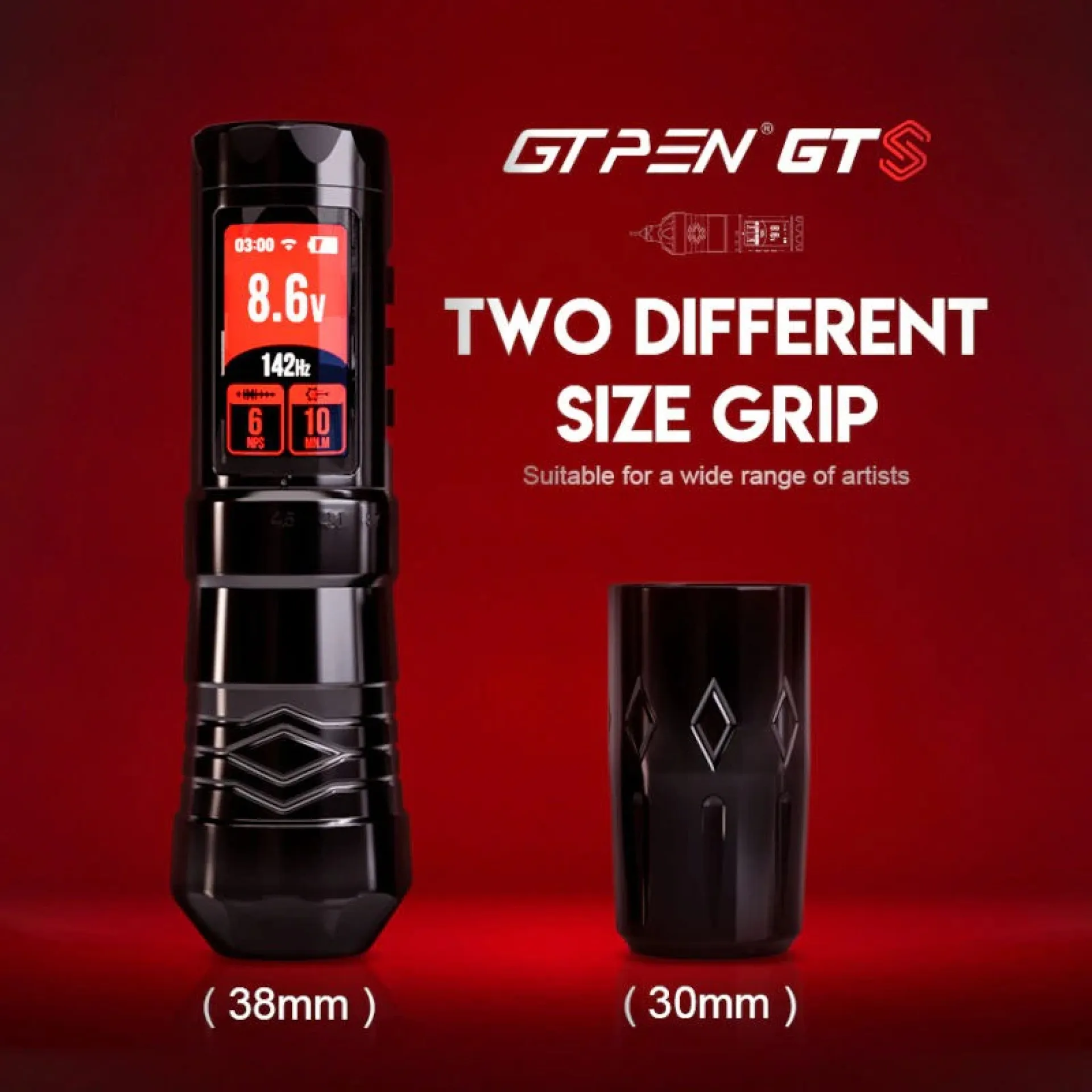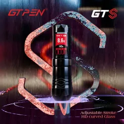 Безжична машинка GTS от марката AVA на пръв поглед прилича на модела GTR, но това не са идентични устройства. Основните разлики са в техническите параметри – GTS е по-лесна за използване и е идеална за начинаещи, докато GTR предлага по-висока мощност и е по-подходяща за опитни професионалисти с по-високи изисквания. Подобно на GTR, GTS също е мултифункционална машинка, предназначена както за татуиране, така и за SMP. Разполага с регулируем ход, честота и въртящ момент, което я прави лесно адаптивна към различни техники и типове кожа. В сравнение с GTR, ходът се настройва по-просто – чрез завъртане на пръстена с разграфена скала. Устройството е оборудвано с цветен дисплей с висока резолюция, който показва текущия работен режим, напрежение, честота, въртящ момент, работно време, мощност и състояние на батерията. Управлението е интуитивно – особено подходящо за начинаещи татуисти.