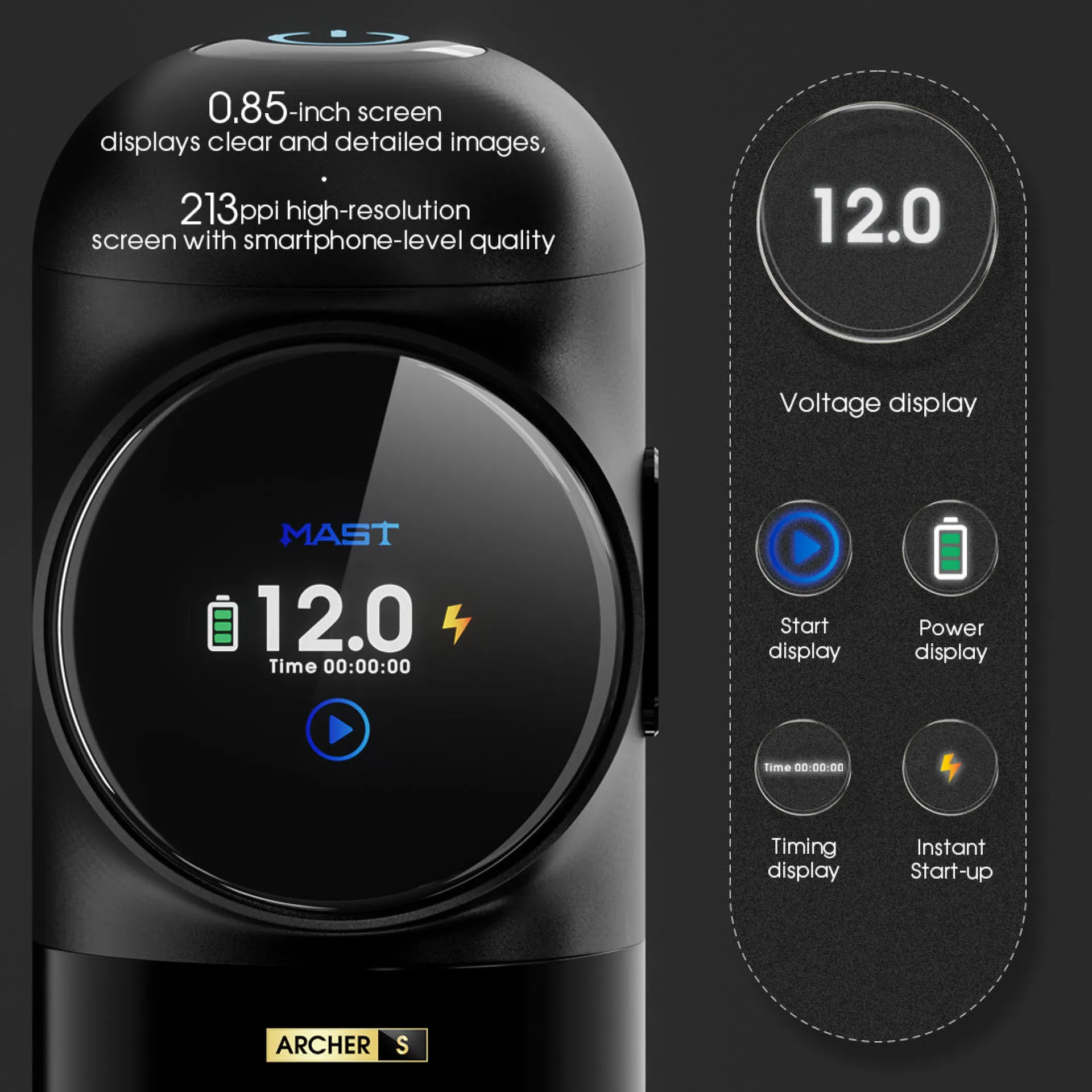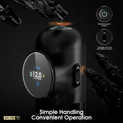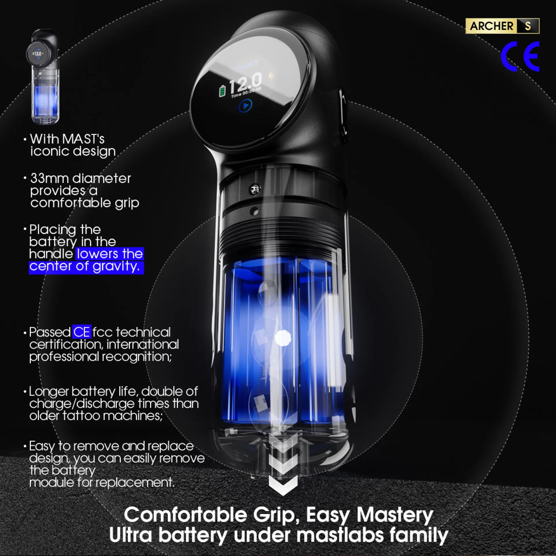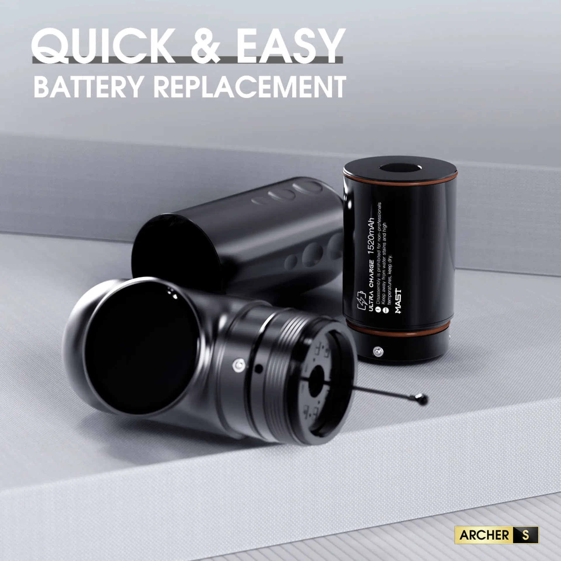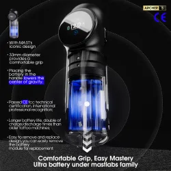 Батерията на MAST Archer S е с капацитет 2300mAh и е оборудвана с интелигентен OLED дисплей, който показва текущото напрежение, нивото на батерията и времето за работа, осигурявайки максимален контрол. Система за бързо зареждане осигурява до 1 час работа само след 10 минути зареждане, а пълното зареждане дава повече от 6,5 часа непрекъсната работа. Ергономичният дизайн осигурява комфорт при дълги сесии