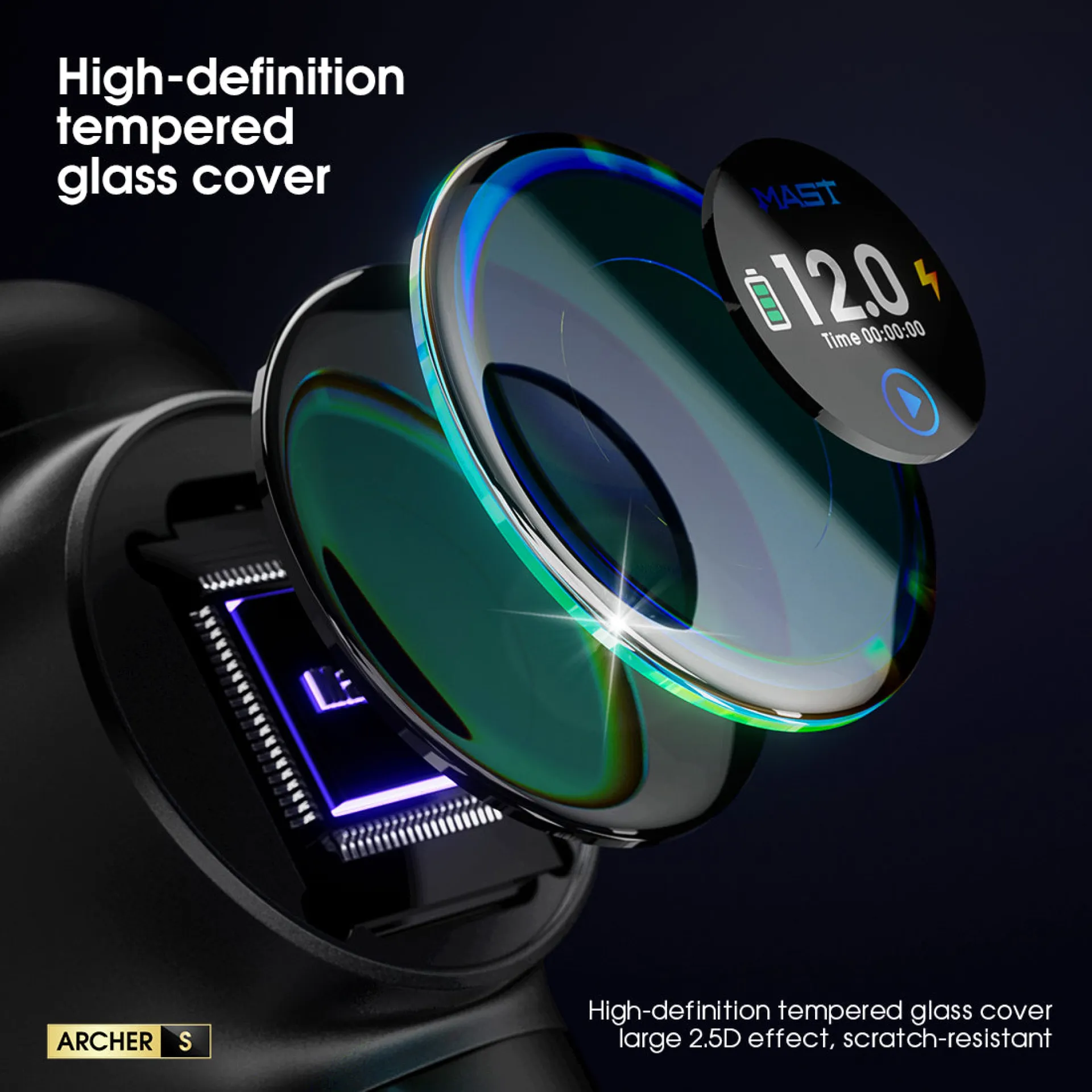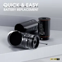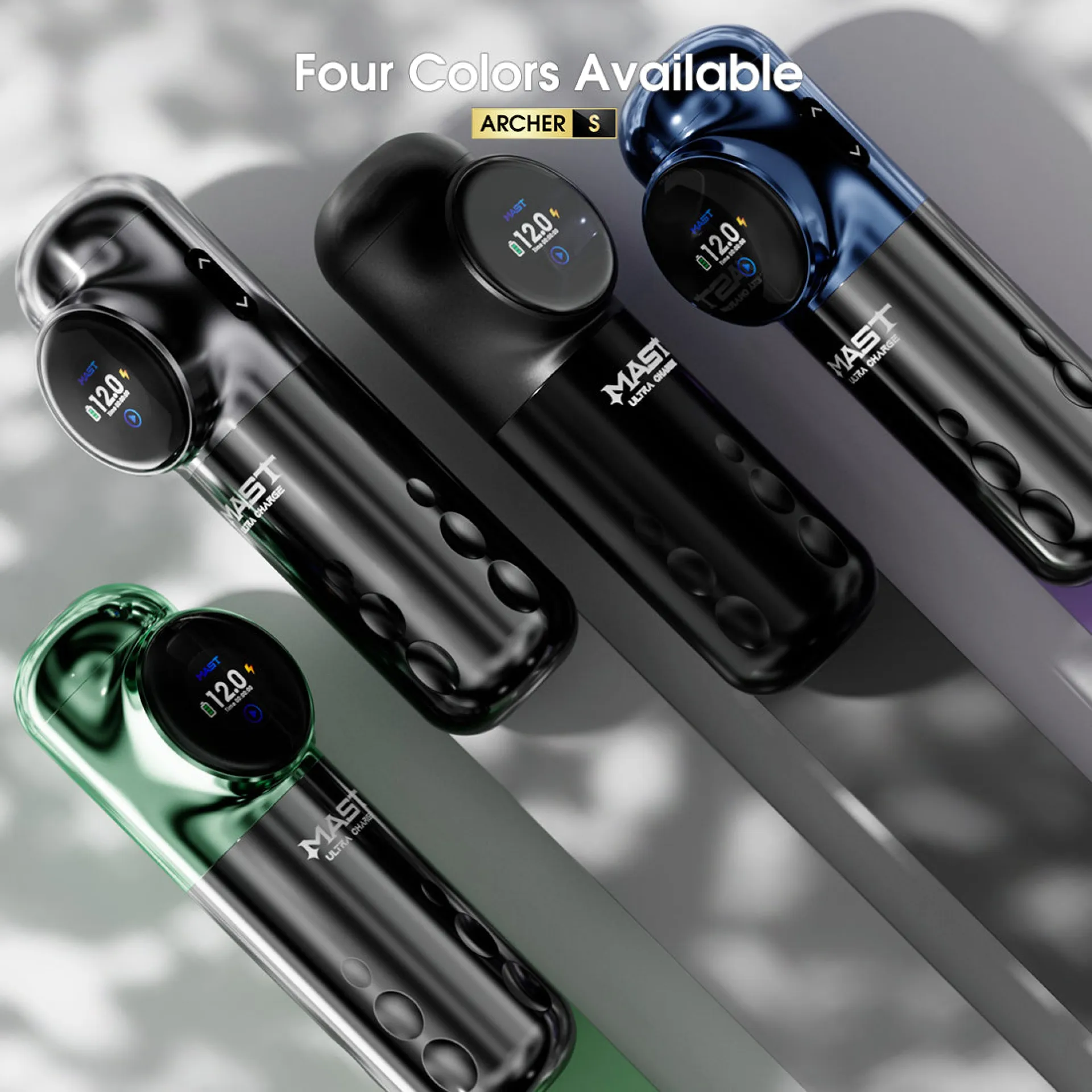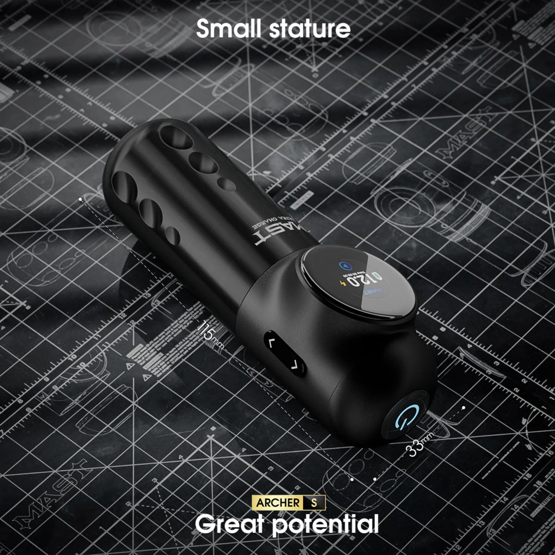 Батерията на MAST Archer S е с капацитет 2300mAh и е оборудвана с интелигентен OLED дисплей, който показва текущото напрежение, нивото на батерията и времето за работа, осигурявайки максимален контрол. Система за бързо зареждане осигурява до 1 час работа само след 10 минути зареждане, а пълното зареждане дава повече от 6,5 часа непрекъсната работа. Ергономичният дизайн осигурява комфорт при дълги сесии