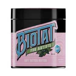 Използвайте като обикновен вазелин, но с допълнителен ефект на обезболяване. Значително намалява подуването и зачервяването. За разлика от продуктите с лидокаин, не подува кожата и не пречи на татуирането. Biotat Zen Tattoo Butter перфектно овлажнява кожата, не запушва иглите и не изтрива шаблона. Нанасяйте при нужда по време на сесията – за максимален ефект върху вече раздразнена кожа.