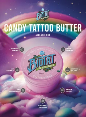 Растителното масло за татуировки CANDY със сладък аромат на бонбони от марката BIOTAT съчетава грижа, комфорт и релакс в един продукт. Съдържа подхранващи натурални съставки като кокосово масло, гроздово масло, карамфил, ший и манго масло. Продуктите на Biotat са първите в света 100% натурални с упойващо действие, без химикали като лидокаин. Присъединете се към революцията в татуирането и работете без болка, в хармония с природата.