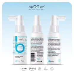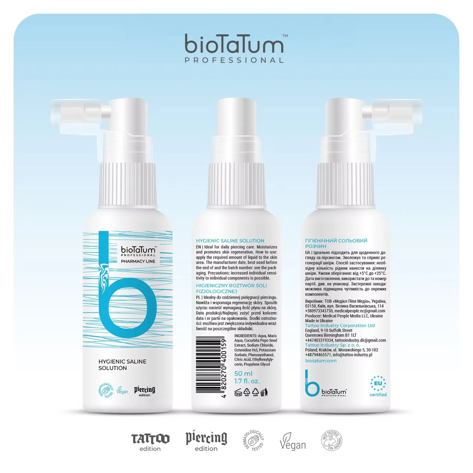 Saline Solution от BIOTATUM е солен разтвор в спрей, предназначен за ежедневна грижа и почистване на пиърсинг. Благодарение на съдържанието на морска сол (Maris Aqua) и Octenidine HCl – антисептик, използван за дезинфекция на кожата и рани, той ефективно почиства, защитава и подпомага поддържането на естествения баланс на кожата след пиърсинг. Разтворът е обогатен и с екстракт от тиквени семки (Cucurbita Pepo), който успокоява и подхранва кожата, а лимонената киселина подпомага нейната чистота и свежест. Безалкохолната формула е нежна и безопасна дори за чувствителна кожа, подходяща за професионална и домашна употреба.