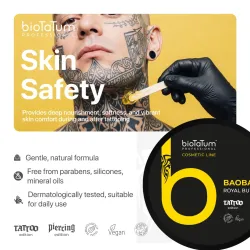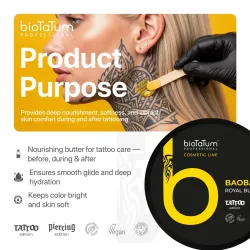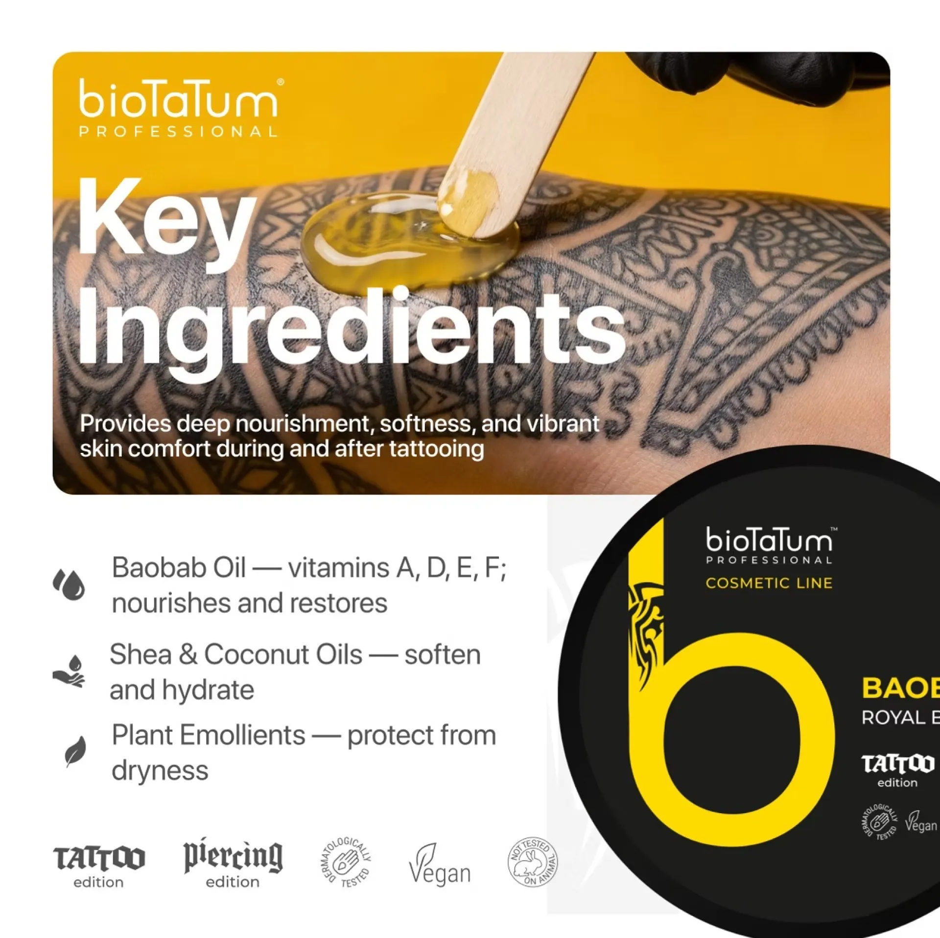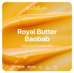 Луксозно масло, предназначено за интензивна грижа за кожата по време на татуиране и след него. Формулата е обогатена с екстракт от баобаб, масло от ший и витамин E, които дълбоко подхранват, хидратират и възстановяват комфорта и еластичността на кожата. Маслото едновременно успокоява раздразненията, намалява зачервяването и поддържа кожата гладка, без да запушва порите. Royal Butter Baobab има приятен, нежен аромат, не премахва шаблона и се плъзга лесно по кожата.