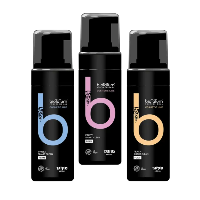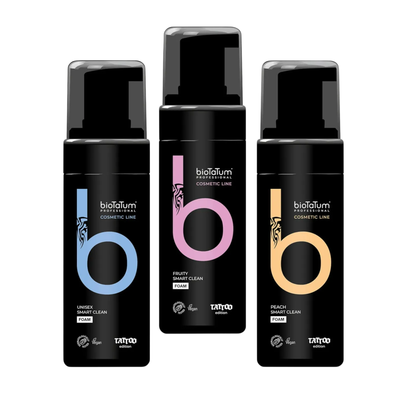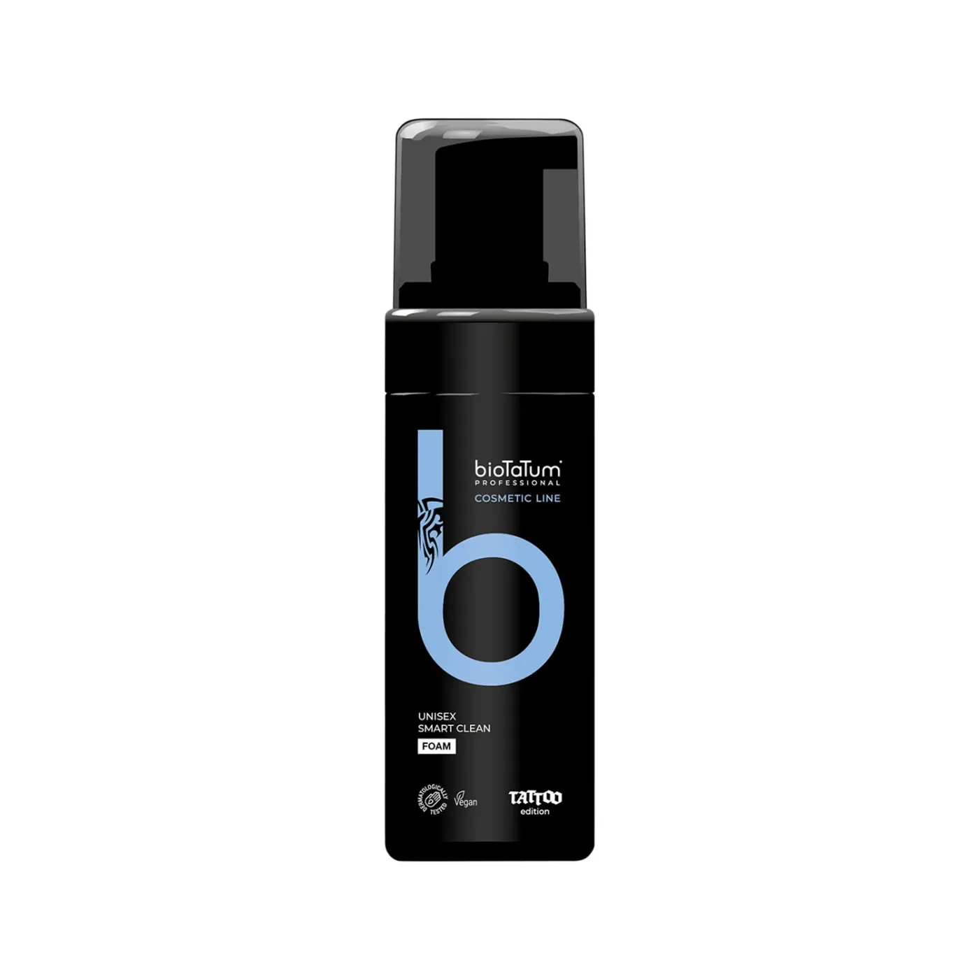 Нежната почистваща пяна Smart Clean от BioTaTum деликатно почиства, хидратира и успокоява кожата преди и по време на татуиране. Благодарение на леката си и въздушна текстура ефективно премахва замърсяванията и излишния пигмент, без да причинява парене или дразнене.