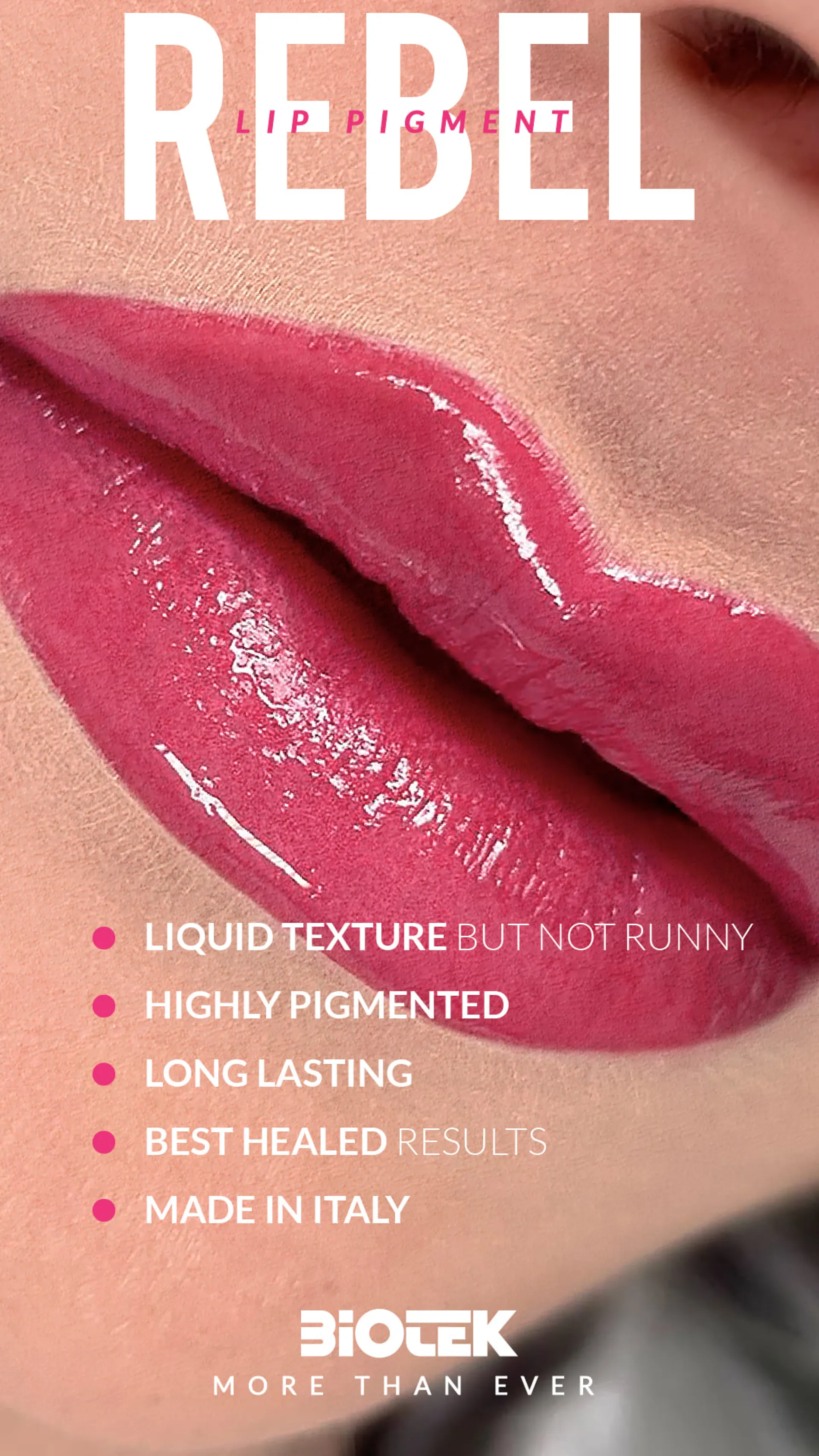 Пигментите за PMU BIOTEK Milano са с доказано качество от 1987 г. Тази италианска компания сега предлага нова линия пигменти „More Than Ever“, които напълно отговарят на най-новите разпоредби на ЕС (Tattoo REACH 2023) и с нов дизайн на бутилката, който ще удължи трайността на цвета до 5 години. Всичко това благодарение на безвъздушната система, която предотвратява навлизането на въздух в бутилката по време на нанасяне и същевременно ви позволява да използвате пигмента до последната капка - така че няма повече разхищение.