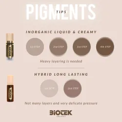 Марката BIOTEK, която има 40 години опит на пазара на PMU, предлага нови дълготрайни хибридни цветове, направени от смес от органични и неорганични прахове, за да ви дадат невероятни резултати още от първата сесия. Благодарение на специалната добавка и полимеризацията на пигмента, ще постигнете красиви резултати. Новата гама хибридни дълготрайни цветове от Biotek е създадена да гарантира дълготраен, но не и перманентен резултат. Препоръчва се корекция след 2 или 3 години. Подходящ и за мазна/проблемна кожа.