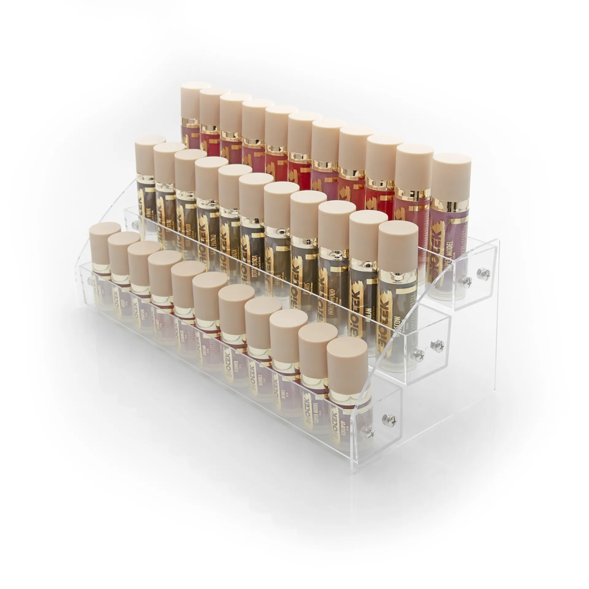 Прозрачната стойка от плексиглас, състояща се от 3 рафта, е идеална за съхранение на всички ваши бои Biotek.