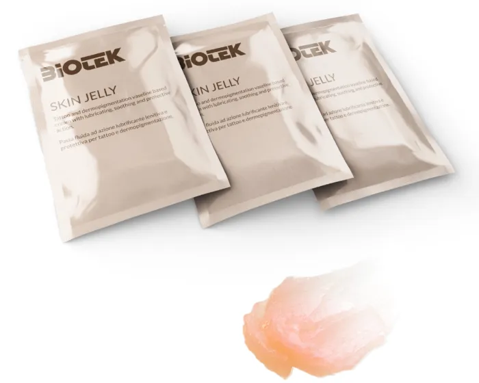 Skin Jelly от Biotek е успокояваща и защитна паста, която се нанася върху третираната зона на устните след PMU процедура. Високата му хидратираща сила намалява образуването на струпеи по време на лечебната фаза. Сашетата от 5 мл са перфектната форма за домашна грижа за вашия клиент след процедурата.