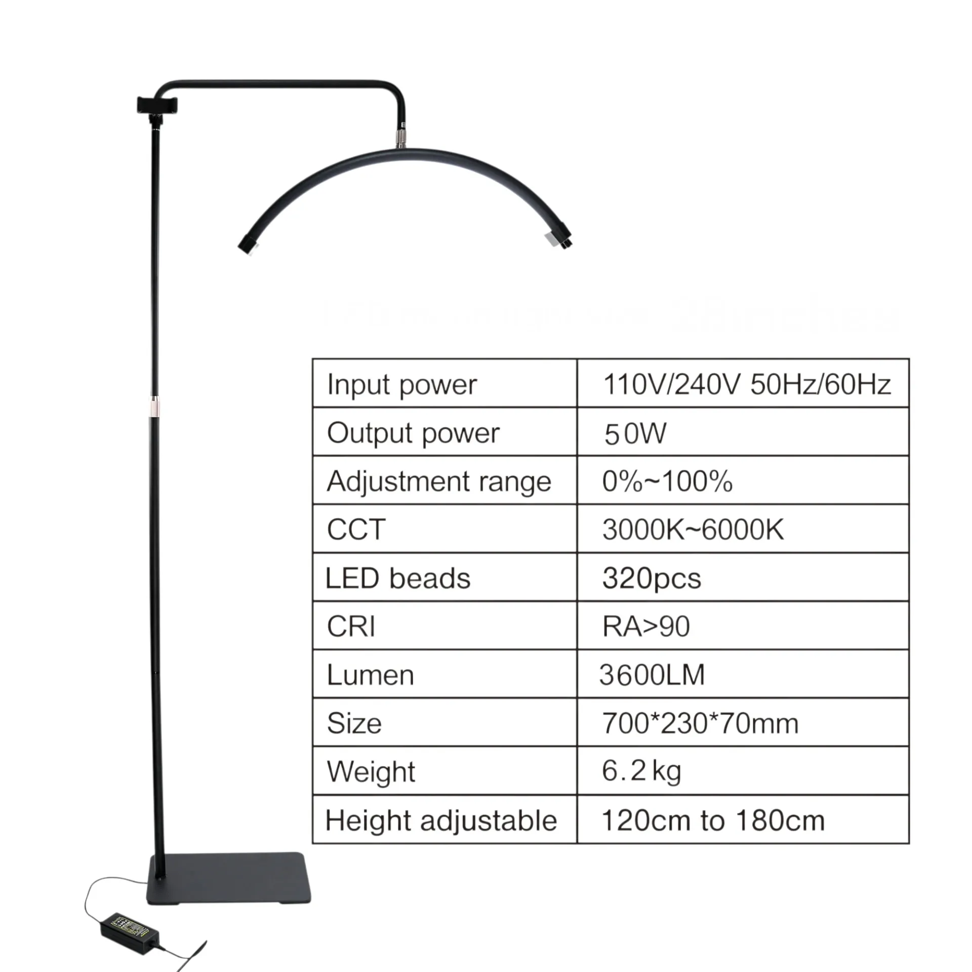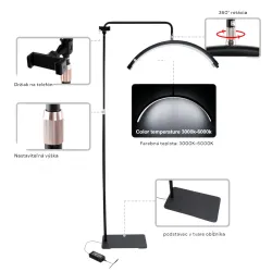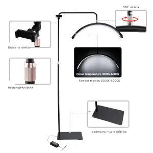 Съдържание на пакета : полукръгла лампа, стойка за телефон, адаптер със захранващ кабел, регулируем статив, основа за лампата