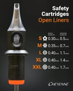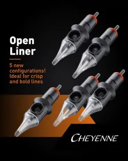Open Liner е нова линия в категорията Safety от немския производител Cheyenne. Те са предназначени за всички художници, които трябва да създават дебели и богати линии с един щрих. Иглите се насочват по обиколката и също запълват центъра, подобно на иглите Round Shader, но с разликата, че краищата им са по-плътно прибрани един към друг, а периферните игли са особено остри.