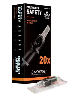 Картриджите Cheyenne® Safety са основен елемент в света на иглените модули за татуировки. Именно този вид даде началото на революцията в татуирането, която донесе възможността за незабавна смяна на игли, повишена хигиена и безопасност на работното място. Cartridge Safety се произвежда в Германия като медицинско изделие. Използват се най-висококачествена стомана, прозрачна фармацевтична пластмаса Lexan и предпазна мембрана, за да се предотврати замърсяване на машината.