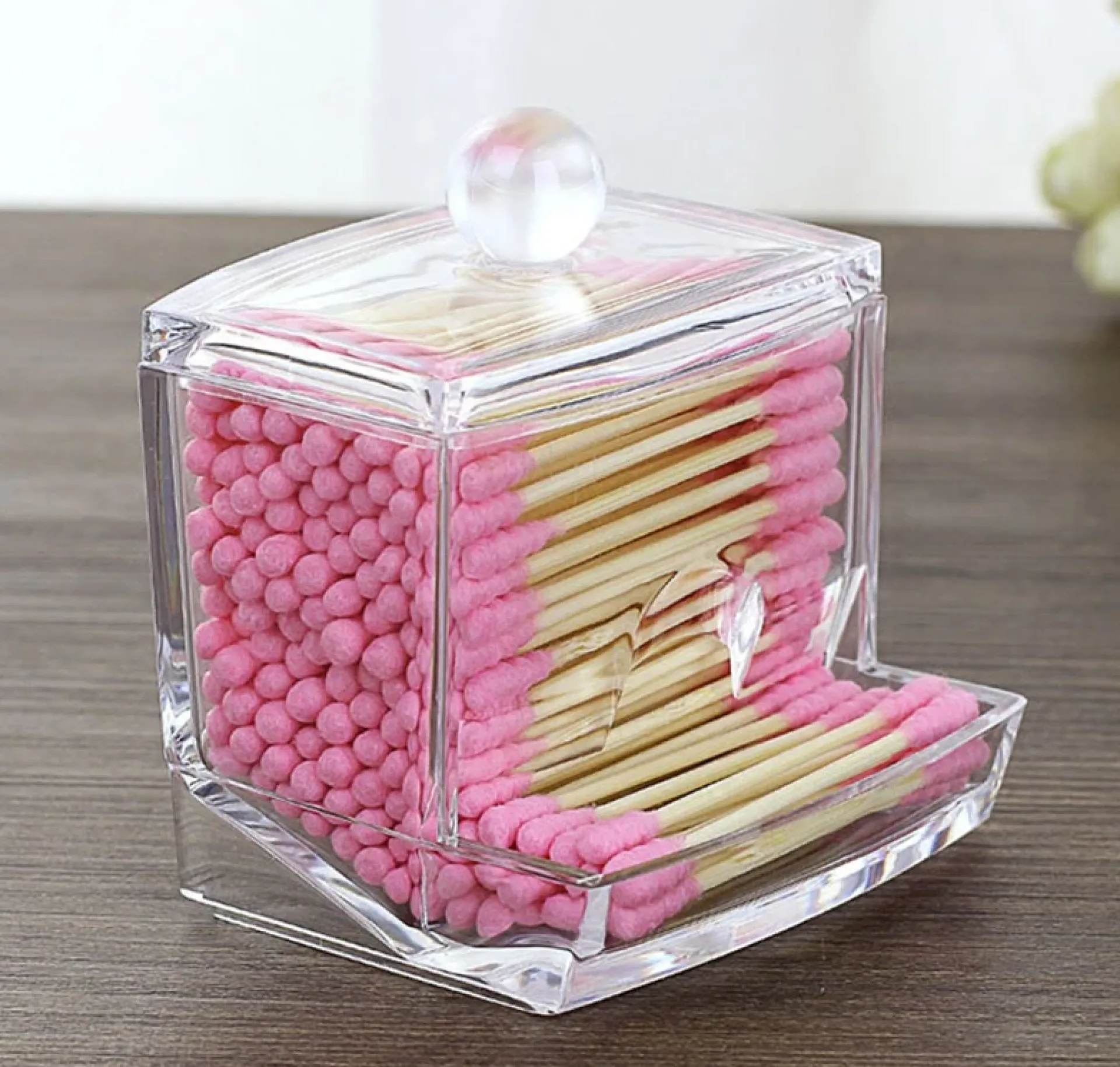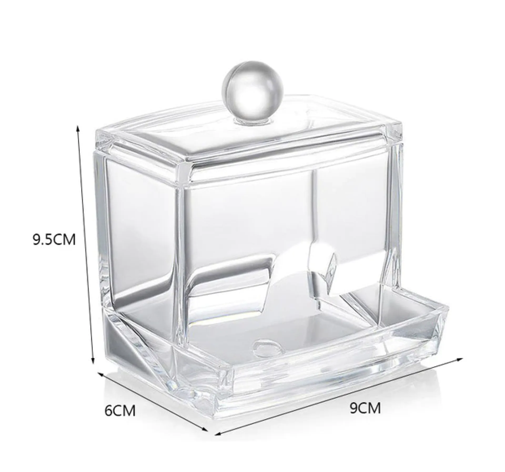 Елегантен и много практичен дозатор за апликатори и памучни тампони. Задължително нещо във всеки салон за красота. Изработен е от издръжлива прозрачна пластмаса. Органайзерът има долен отвор, който улеснява хващането на пръчките. Включен е и подвижен горен капак с дръжка.