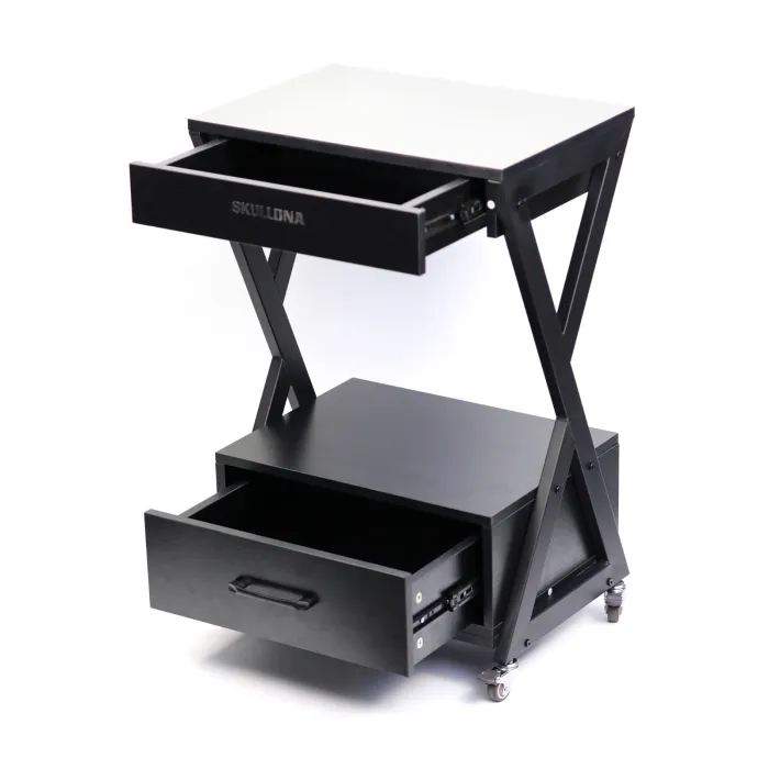 Мобилната маса от марката SKULL DNA е проектирана да осигури комфортна работа и организация на всички необходими инструменти. Има метална рамка, боядисана в черно, плавно движещи се колелца и две чекмеджета за съхранение, устойчиви на повреди. Тази компактна, мобилна маса е лесна за почистване и позволява лесно движение из студиото по време на работа. Тя се превръща в практичен и ефективен инструмент, модерно, дизайнерско изделие и същевременно позволява лесен достъп до инструменти и оборудване за татуиране.