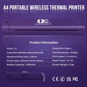 DUKEGLO H2 е компактен и модерен безжичен термален принтер, проектиран с акцент върху прецизността, простотата и мобилността. Благодарение на резолюция от 203 DPI, позволява печат на остри линии и точни детайли.