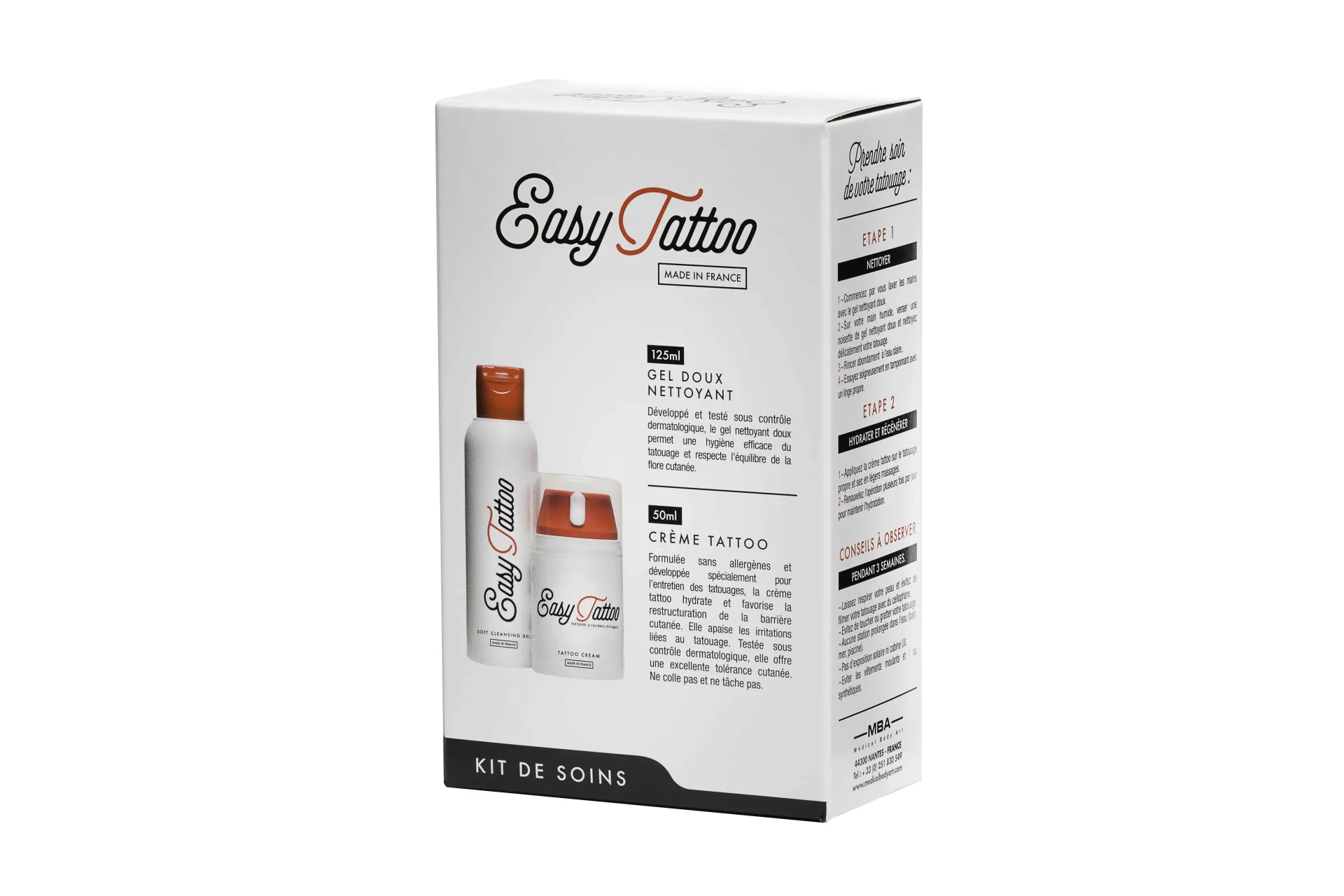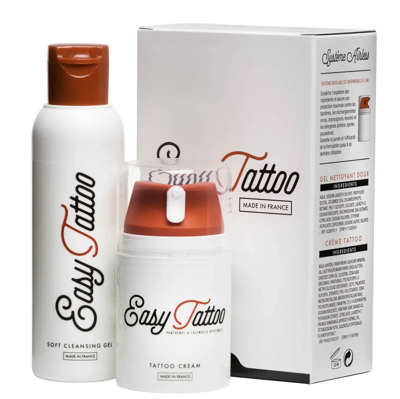 Комплект от крем за последваща грижа и почистващ гел на страхотна цена от френския производител на козметика за татуировки и пиърсинг Easytattoo. Опаковката е подходяща като пакет за последваща грижа за салони за татуировки и козметика, но също така и за крайния клиент. Комплектът съдържа лечебен крем с помпа в обем 50мл и почистващ разтвор в обем 125мл. Възможно е да се закупи: