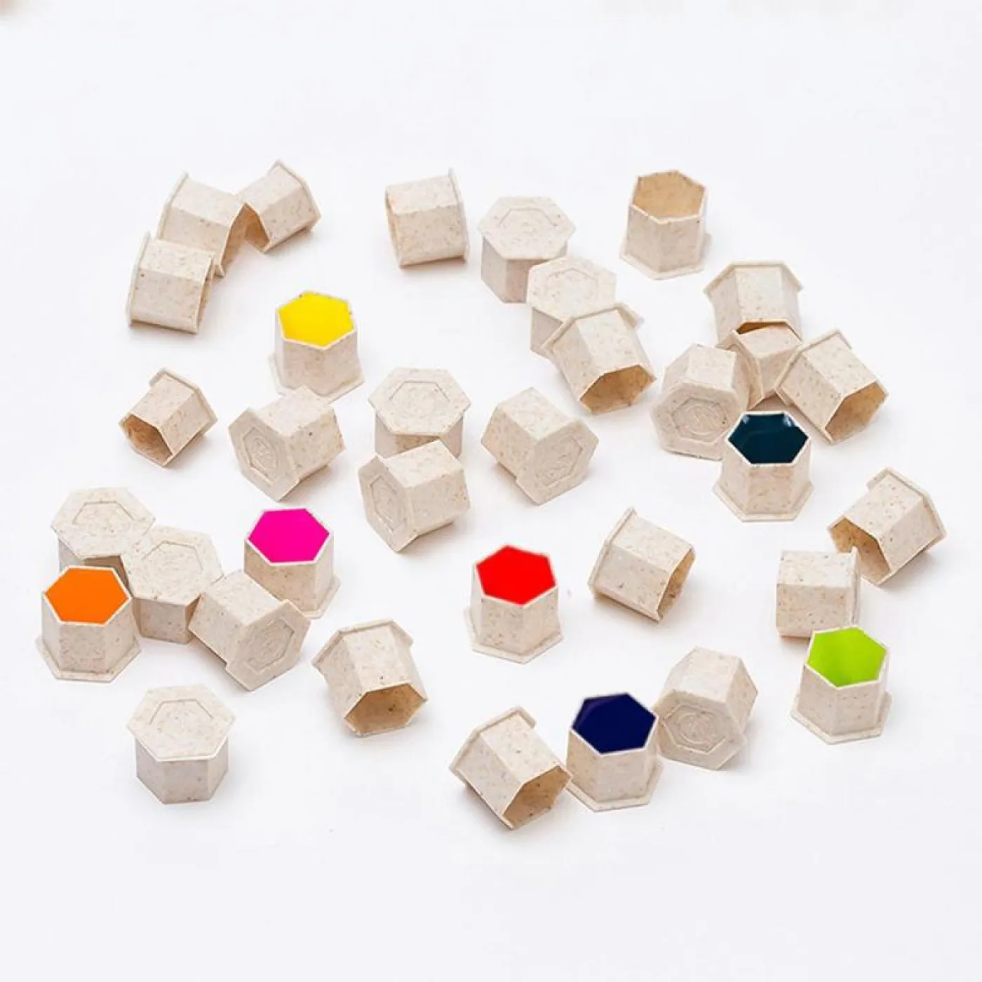 Екологичните капачки за мастило са изработени от пшенична слама и PP. Тази комбинация създава PLA материал, който е 100% биоразградим. Има 3 различни размера, от които да избирате. Една опаковка съдържа 200 броя.
