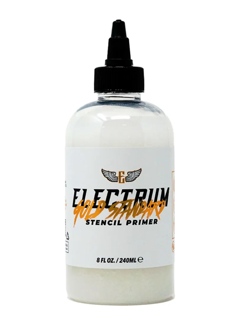 GOLD STANDARD е най-новата иновация на пазара на продукти за трансфер на мотиви. Тестването на продукта преди производството отне почти 3 години и през това време продуктът беше доведен до пълно съвършенство. Gold Standard е базиран на класическия гел препарат Electrum Stencil Primer, но консистенцията му е по-кремообразна и е идеален за художници, които предпочитат този тип консистенция. Отпечатъкът е невероятно прецизен и може да издържи на многократно триене по време на татуиране.