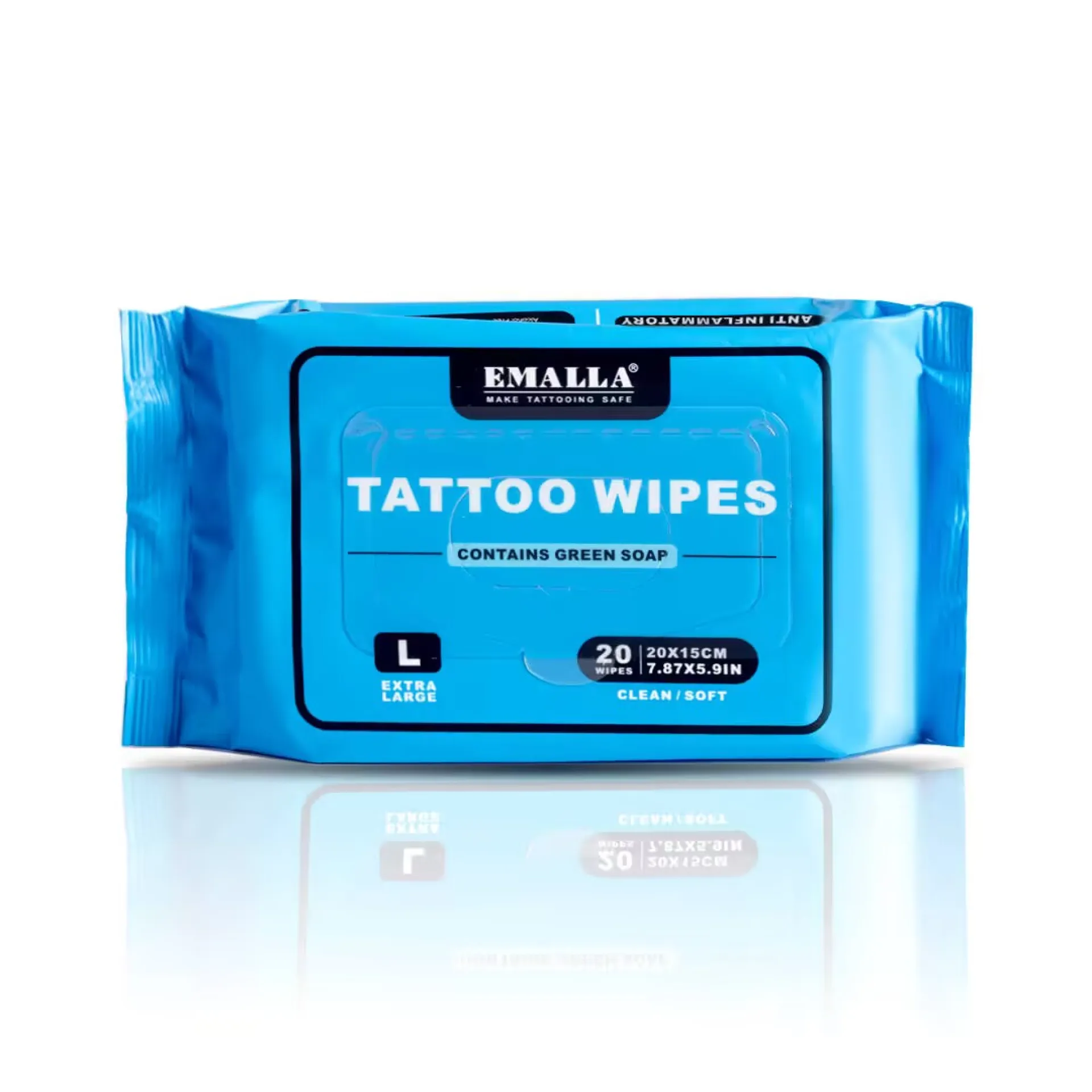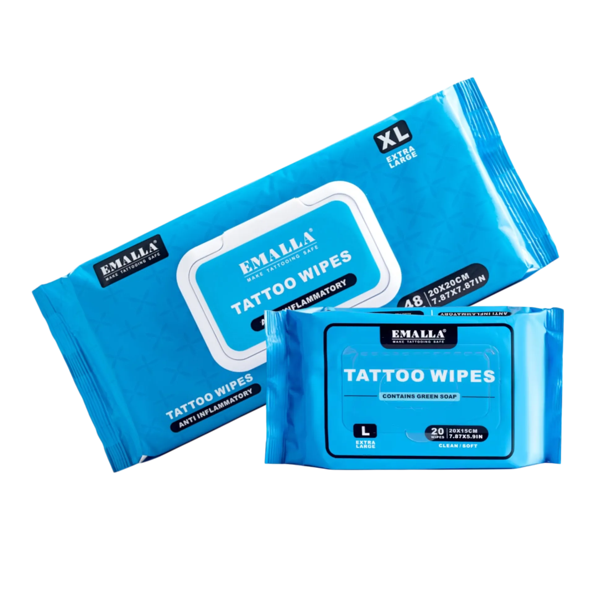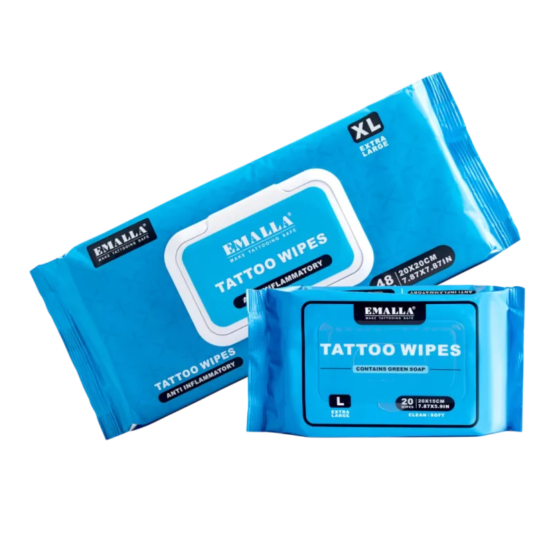 Овлажнените почистващи кърпички EMALLA са създадени за лесно, хигиенно и щадящо почистване на кожата преди, по време и след татуиране. Ефективно премахват излишната мастило, омазняване и нечистотии, като същевременно успокояват кожата, хидратират я и подпомагат нейната регенерация. Предлагат се в два варианта: