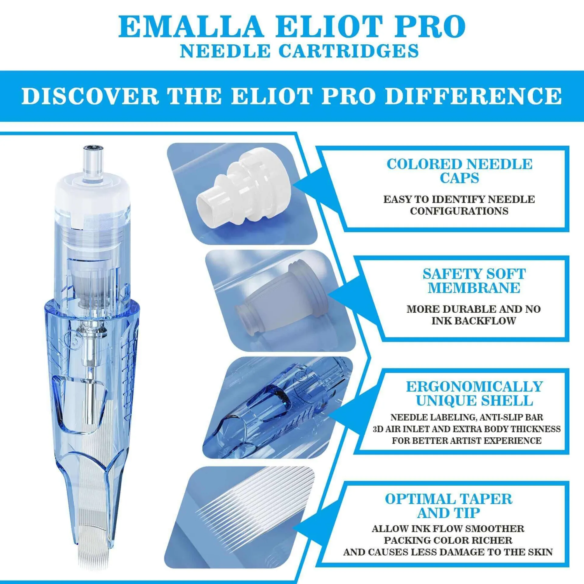 EMALLA ELIOT PRO са висококачествени игли, проектирани за професионална работа в областта на татуировките и постоянния грим (PMU). Основната им цел е да осигурят максимална прецизност, безопасност и комфорт по време на работа, което позволява равномерни и точни резултати. EMALLA ELIOT PRO позволяват равномерно нанасяне на пигмента и обработка на фините детайли, които са важни при линии, сенки или микропигментация. Ергономичният дизайн на иглите осигурява плавен процес на работа, като намалява умората на ръката и увеличава комфорта, особено при по-дълги сесии.