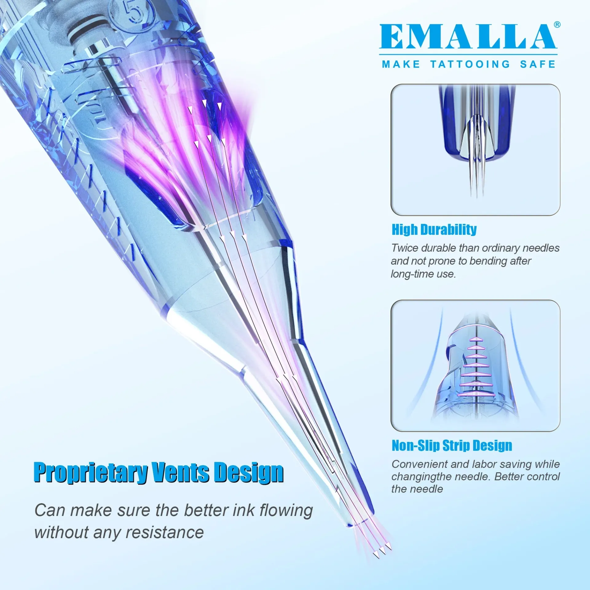 EMALLA ELIOT предлага надеждна мембрана с подсилени ленти, която осигурява правилно движение на иглата и отлични резултати при различни техники на татуиране. От друга страна, EMALLA ELIOT PRO повишава стандарта на иглите до ново ниво. Тя използва трислойна силиконова мембрана, която ефективно предотвратява обратния поток на мастилото и защитава тату машината от замърсявания.
