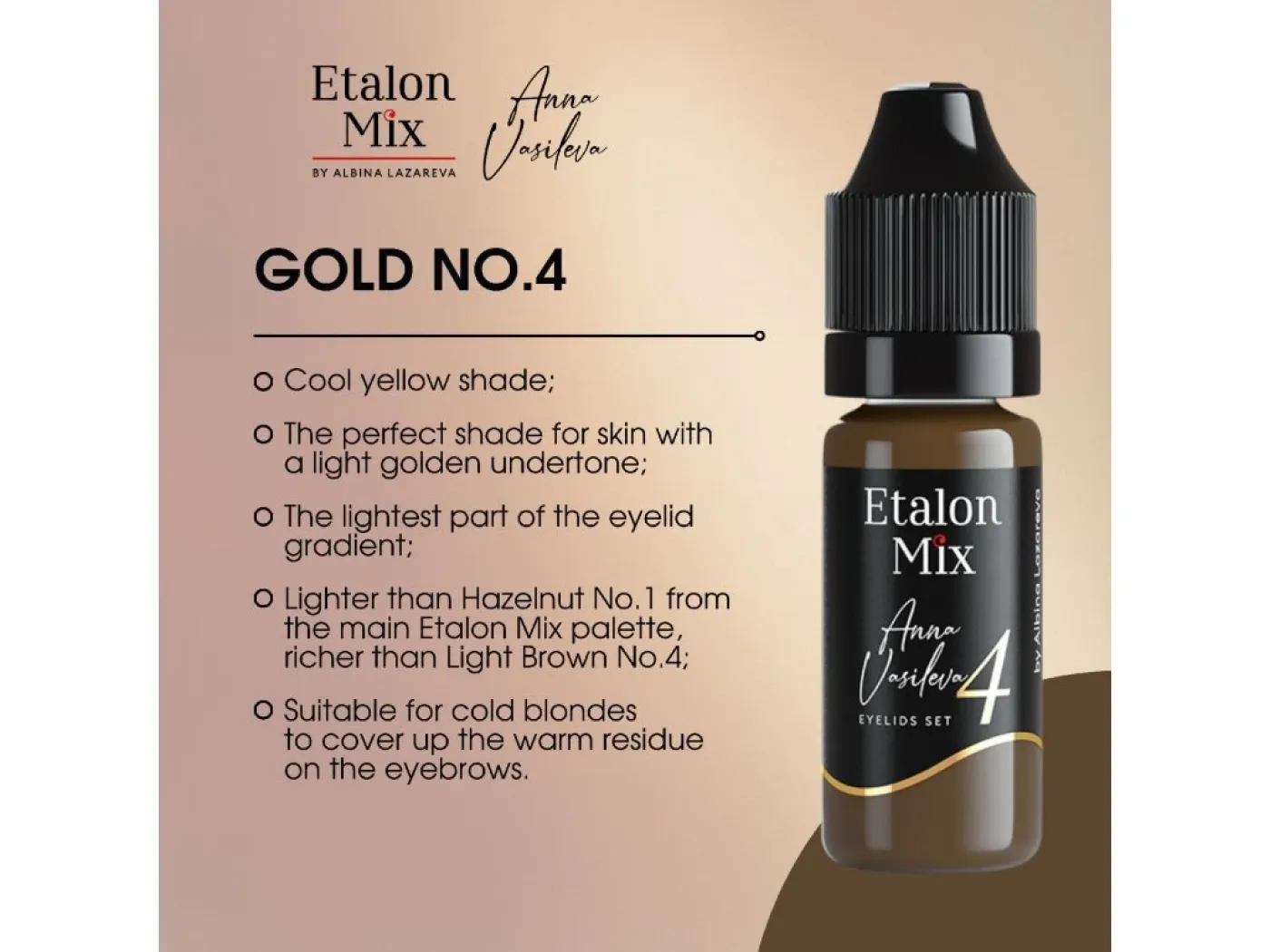 4 GOLD: Студен жълт нюанс, предназначен за изсветляване и омекотяване на градиентите на клепачите. Идеален за светли златисти подтонове на кожата, създава нежен, сияен ефект в горната част на градиента на очната линия и осигурява плавен преход на цветовете. По-светъл от 1 Hazelnut и по-наситен от 4 Light Brown. Подходящ и за студени блондинки за неутрализиране на топлите тонове в веждите.