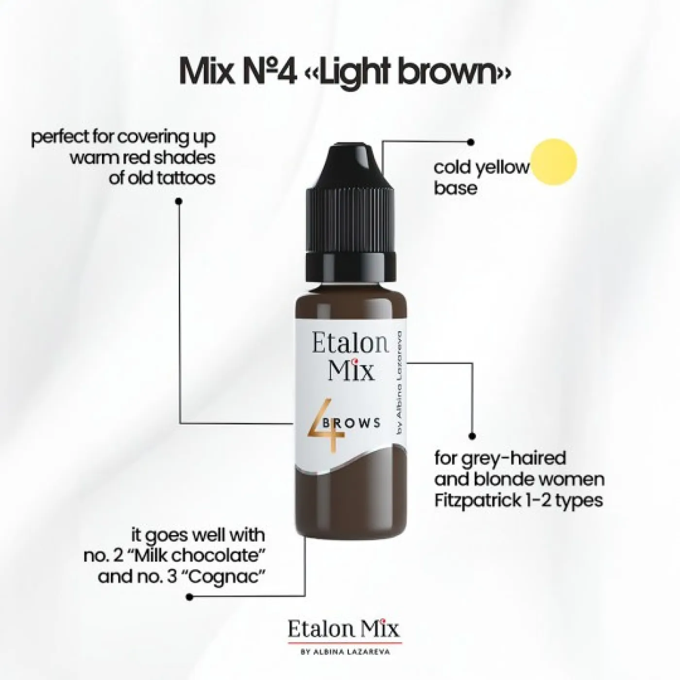 4 LIGHT BROWN – нежен пигмент със жълто-студен подтон, идеален за светла кожа (фототипове 1-2). Перфектен за естествени, елегантни вежди и създаване на плавни преходи при сенкиране на веждите. Отличен избор за неутрализиране на топли тонове.