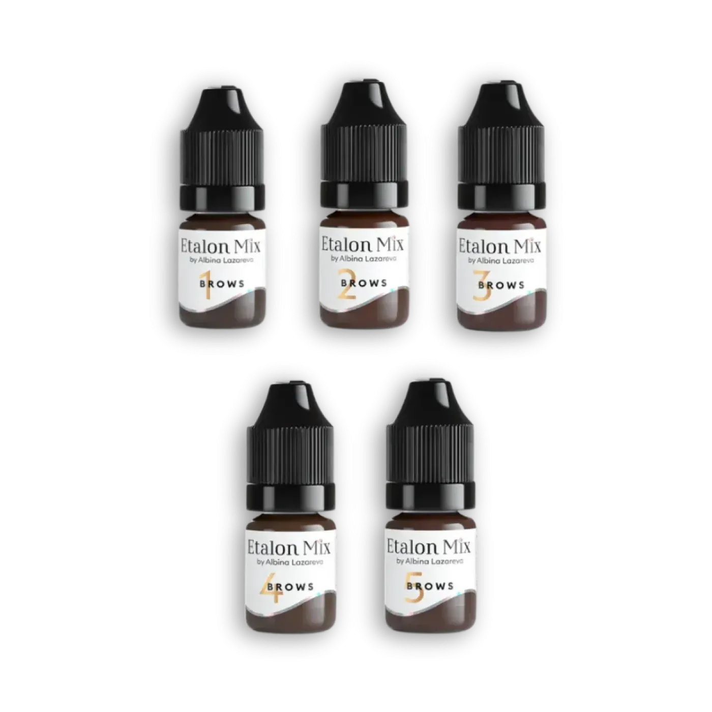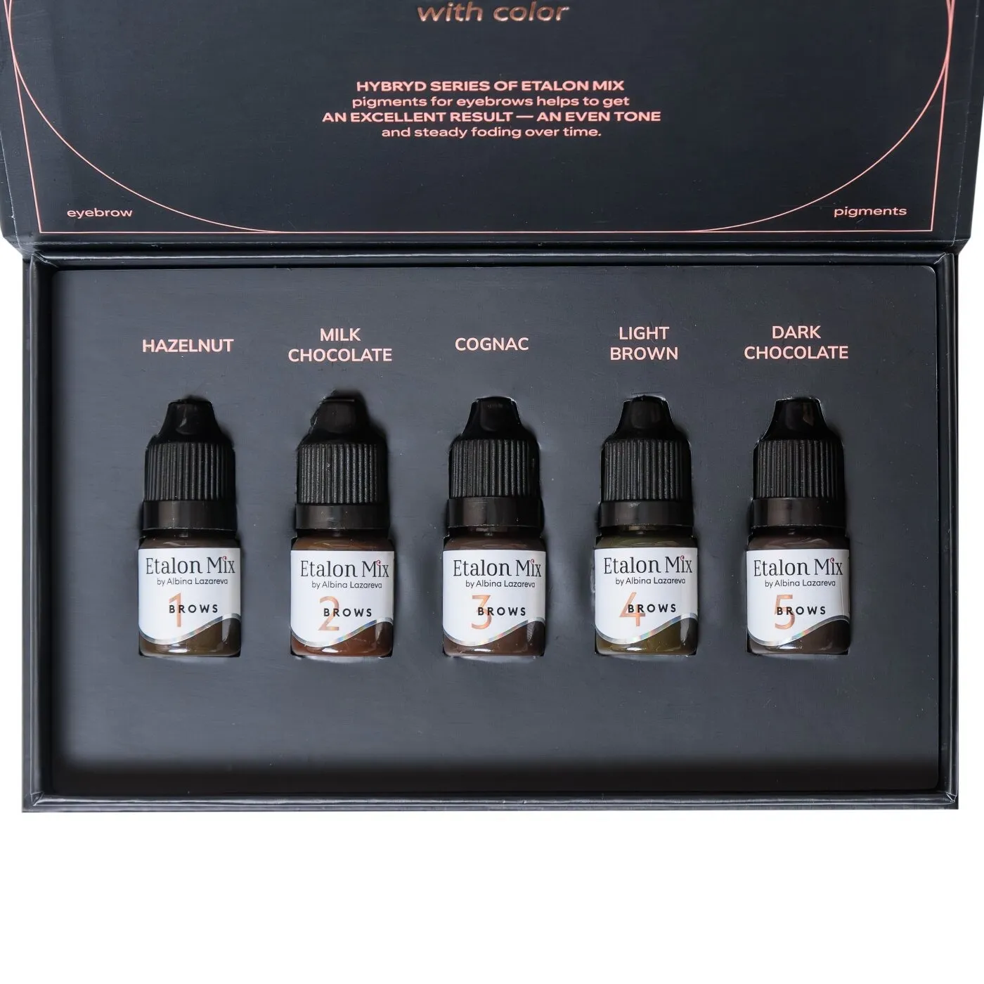ETALON MIX - BROW HYBRID SET е ексклузивна колекция от пет пигмента за вежди, проектирана за всички типове кожа (Fitzpatrick 1–6). Разнообразието на сета позволява създаването на индивидуални нюанси и перфектни цветови комбинации, които точно отговарят на тена на кожата на клиента. Пигментите могат да се използват за хармонични преходи, акценти или задълбочаване на цвета. Хибридният състав, комбиниращ органични и неорганични съставки, осигурява стабилност на цвета, равномерно нанасяне и контролирано заздравяване. Сетът е подходящ за всички техники на веждите.