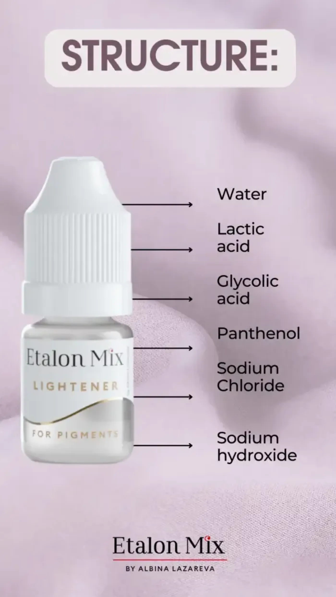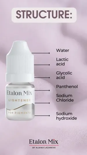 ETALON MIX - LIGHTENER е професионален продукт за изсветляване или премахване на нежелани пигменти от постоянен грим. Благодарение на комбинацията от млечна и гликолова киселина ефективно разгражда пигмента с минимално натоварване на кожата. Подходящ е за корекция на вежди, устни и очна линия, включително зелени, сини, лилави, жълти и оранжеви тонове. Обогатен с пантенол, подпомага заздравяването и намалява раздразнението. Предназначен е изключително за професионална употреба.
