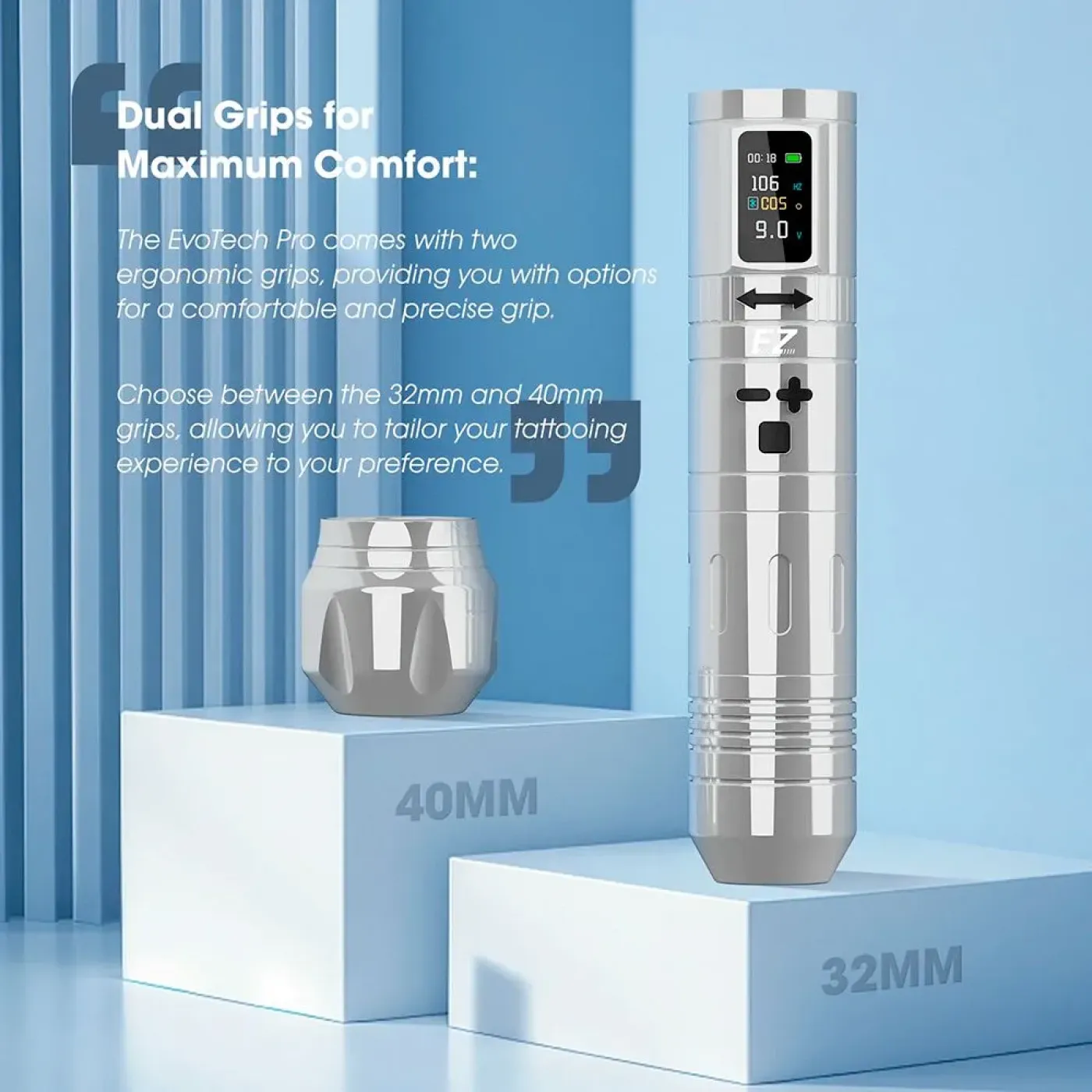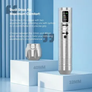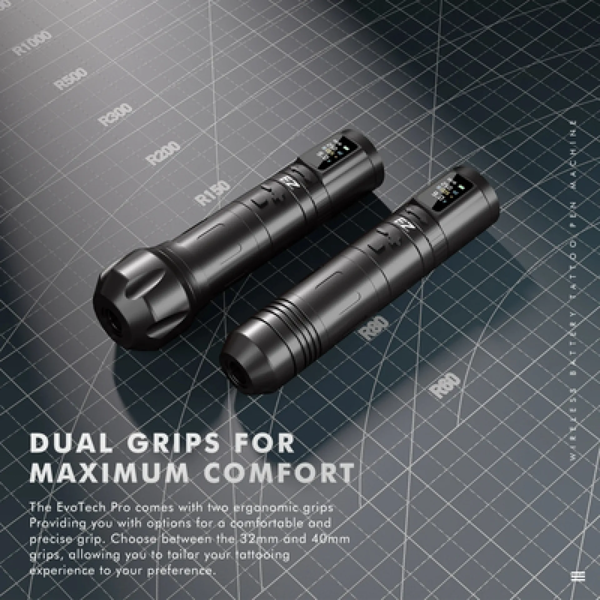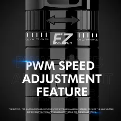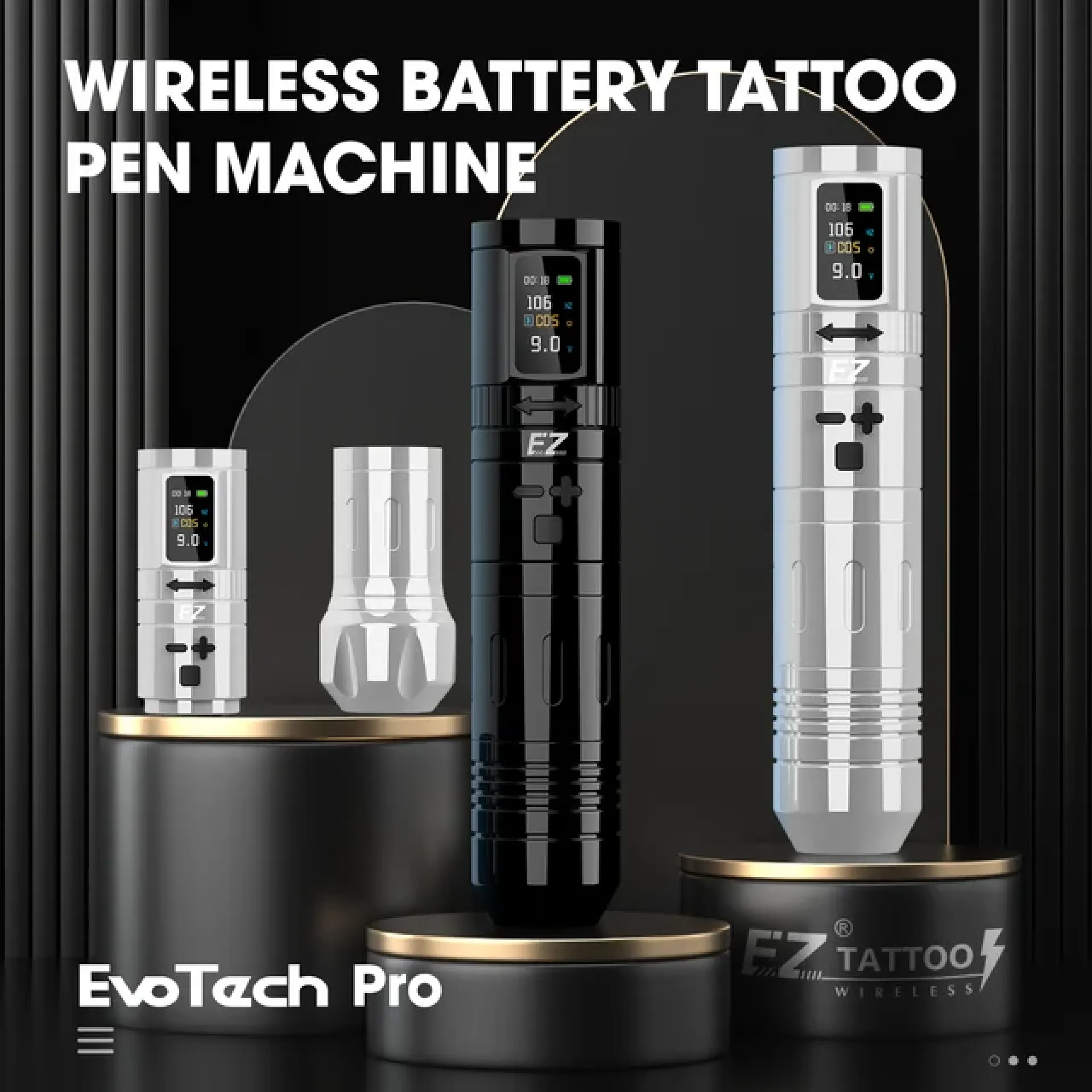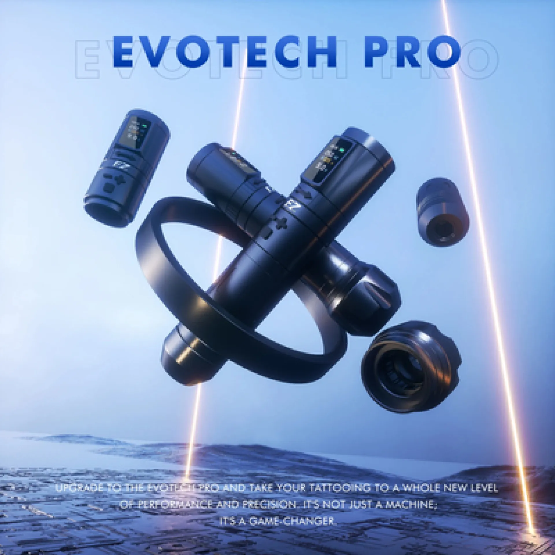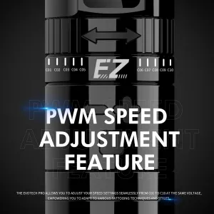 EZ EVO TECH PRO с две батерии от известния производител EZ Tattoo е подобрен премиум модел на своя предшественик, EVO TECH. Чипът EVO TECH PRO позволява прецизно управление на движението на машинката и максимално удължава живота ѝ. Освен това чипът разполага с новост – PWM регулатор, чрез който можете да имате пълен контрол върху настройките на скоростта от C01 до C10 при същото напрежение, позволявайки адаптация към различни техники и стилове на татуиране чрез промяна на честотата при дадено напрежение.