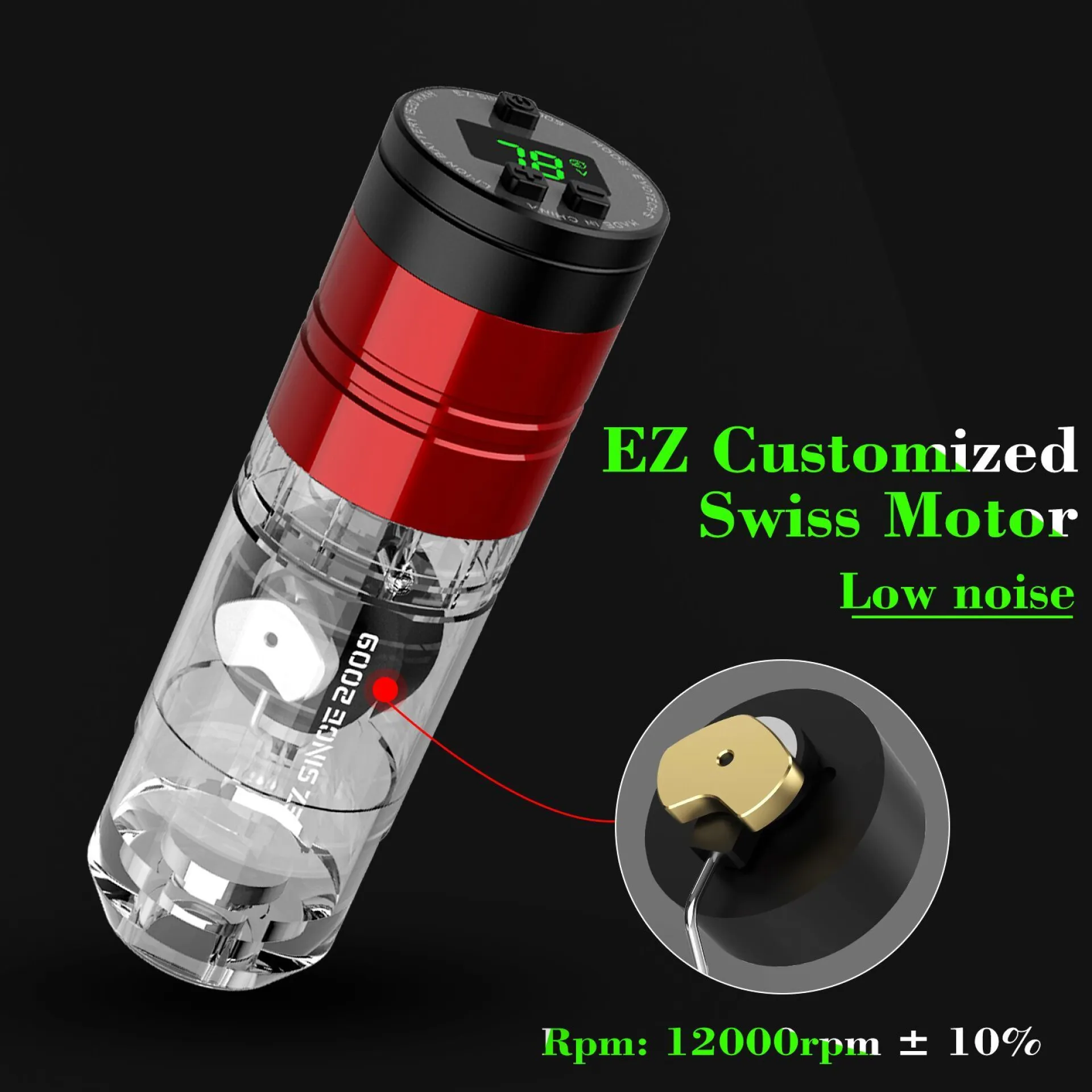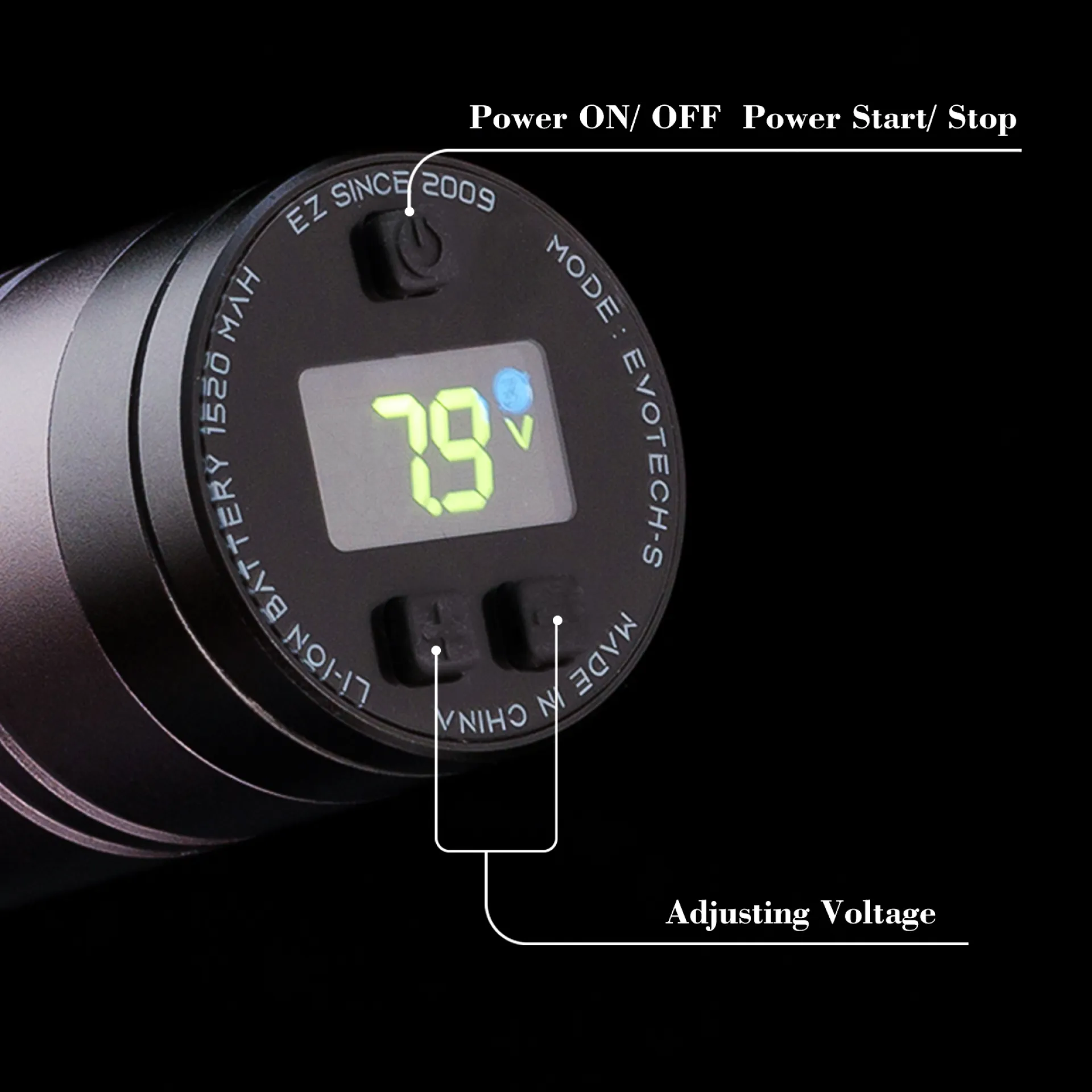 EVO TECH S е ново, по-късо попълнение в семейството на безжичните машини от производителя EZ Tattoo. Както подсказва името, новият модел е базиран на топ модела Evo Tech, но има по-къс корпус, дълъг само 10,8 см и тегло 160 г, което е чудесно за машина с вградена батерия. Моторът на механизма също е нов, той е с директно задвижване и можете да избирате между ход от 3,5 мм или 4,0 мм, което предишната версия не предлагаше. Захранването се осигурява от батерия с капацитет до 1600 mAh.