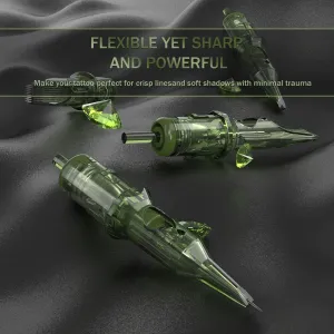 Картридж иглите от известния лидер на пазара - INKin REVO са проектирани да отговорят на нуждите на всеки художник, без да натоварват бюджета му. Иглите INKin REVO предоставят всички основни конфигурации и качество, на които можете да разчитате, за да свършите ежедневната си работа. Всички игли са ръчно изработени от професионалисти на производствената линия и преминават през строги тестове, за да се гарантира, че всяка игла и тяло на патрон са прецизно сглобени за максимално качество на продукта и надеждност при употреба. Матовата повърхност в патрона е проектирана да побира по-голям обем мастило, което води до значително по-дълъг поток на мастилото по време на процеса на татуиране.