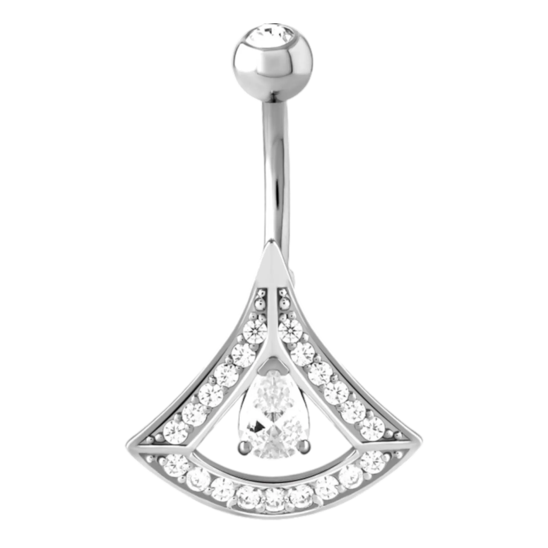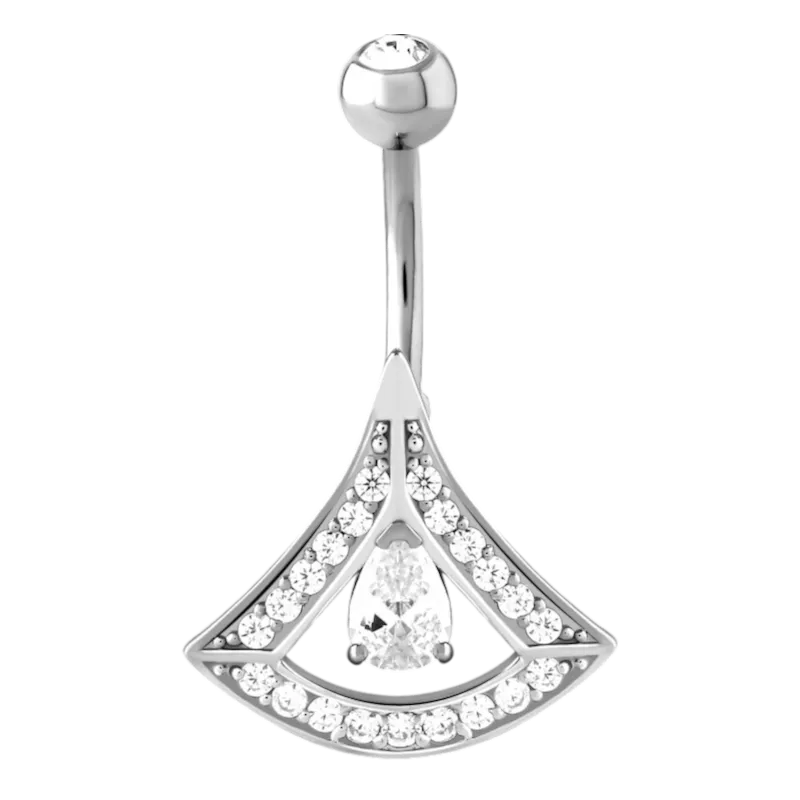 Елегантен пиърсинг за пъп от хирургическа стомана 316L, украсен с блестящи циркони. Дизайнът „fan“ придава на бижуто изискан, но забележим вид – подходящ за ежедневно носене и специални поводи.