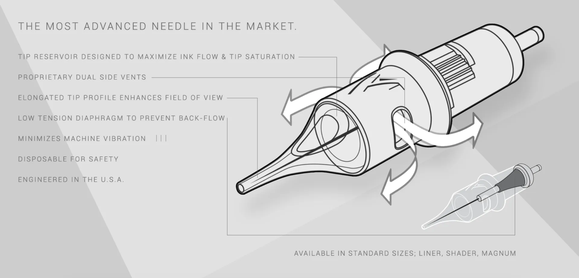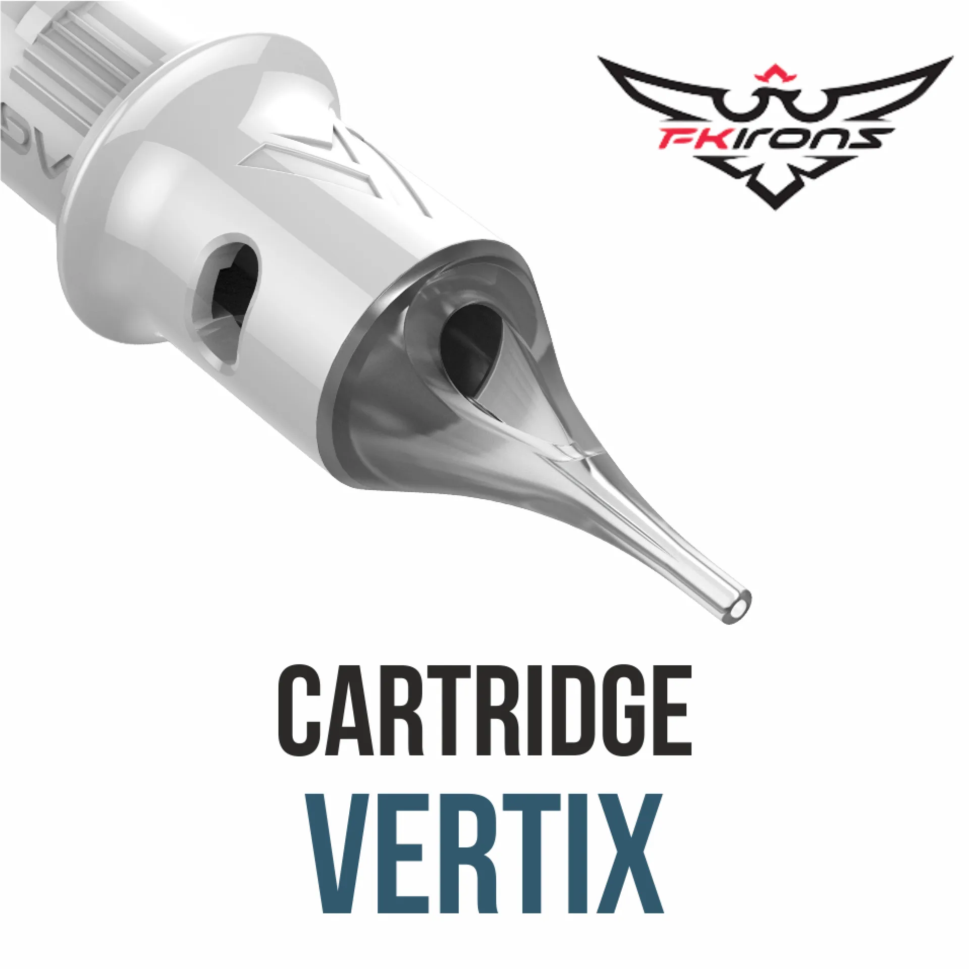 Иглите за картриджи Vertix от американския гигант FK IRONS (Darklab) отговарят на най-високите изисквания за качество на всеки професионалист. Долната част на иглата е изработена от прозрачна фармацевтична пластмаса, което ви осигурява перфектна видимост към върха на иглата. Пластмасовата част също е подвижна, което позволява фино регулиране на иглата според нуждите. Специално проектираната форма задържа повече боя в пластмасовото тяло, а в същото време горните отвори от двете страни могат перфектно и бързо да почистят иглата при изплакване, което ще оцените при смяна на цветовете. Разбира се, има предпазна мембрана, която предотвратява навлизането на кръв, боя или вода в корпуса на машината. Освен това, патроните VERTIX използват специална мека мембрана, която не натоварва двигателя на движение, както е при твърдите гумени мембрани, и значително намалява вибрациите по време на работа.