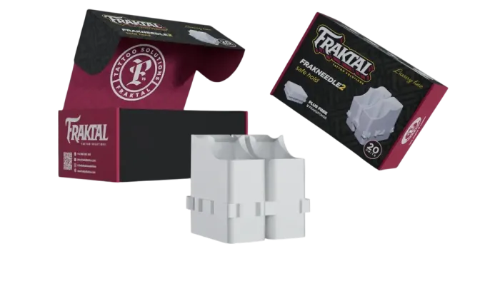 Frakneedle2 е практична и стабилна пластмасова стойка, предназначена за безопасно и подредено поставяне на иглени касети. Всяка част съдържа две отделни отделения, които осигуряват удобно и сигурно поставяне на касетите по време на работа. Стойката е снабдена със свързваща система, която позволява лесно комбиниране с други продукти на Fraktal, така че винаги да имате всичко необходимо под ръка.