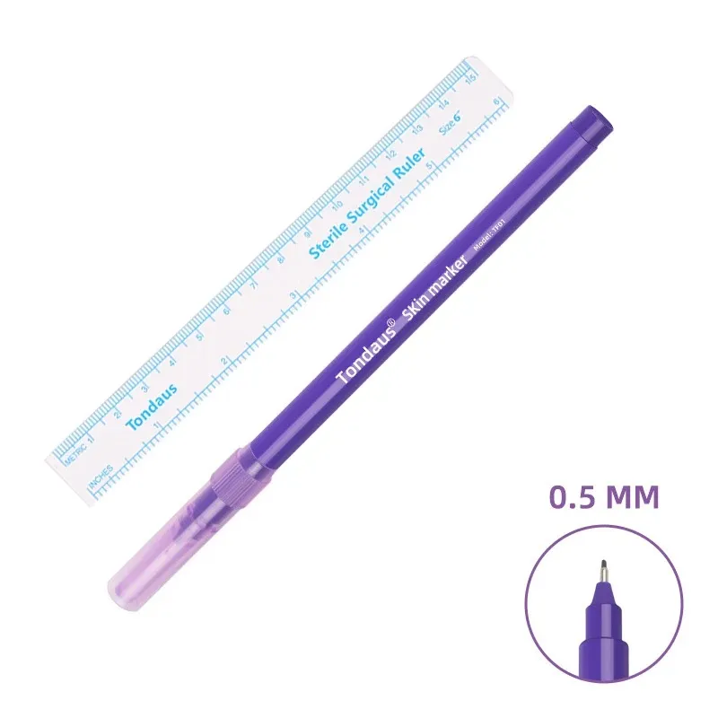Стерилно опакован хирургически маркер за рисуване върху кожата. Комплектът включва и линийка за измерване на симетрията.