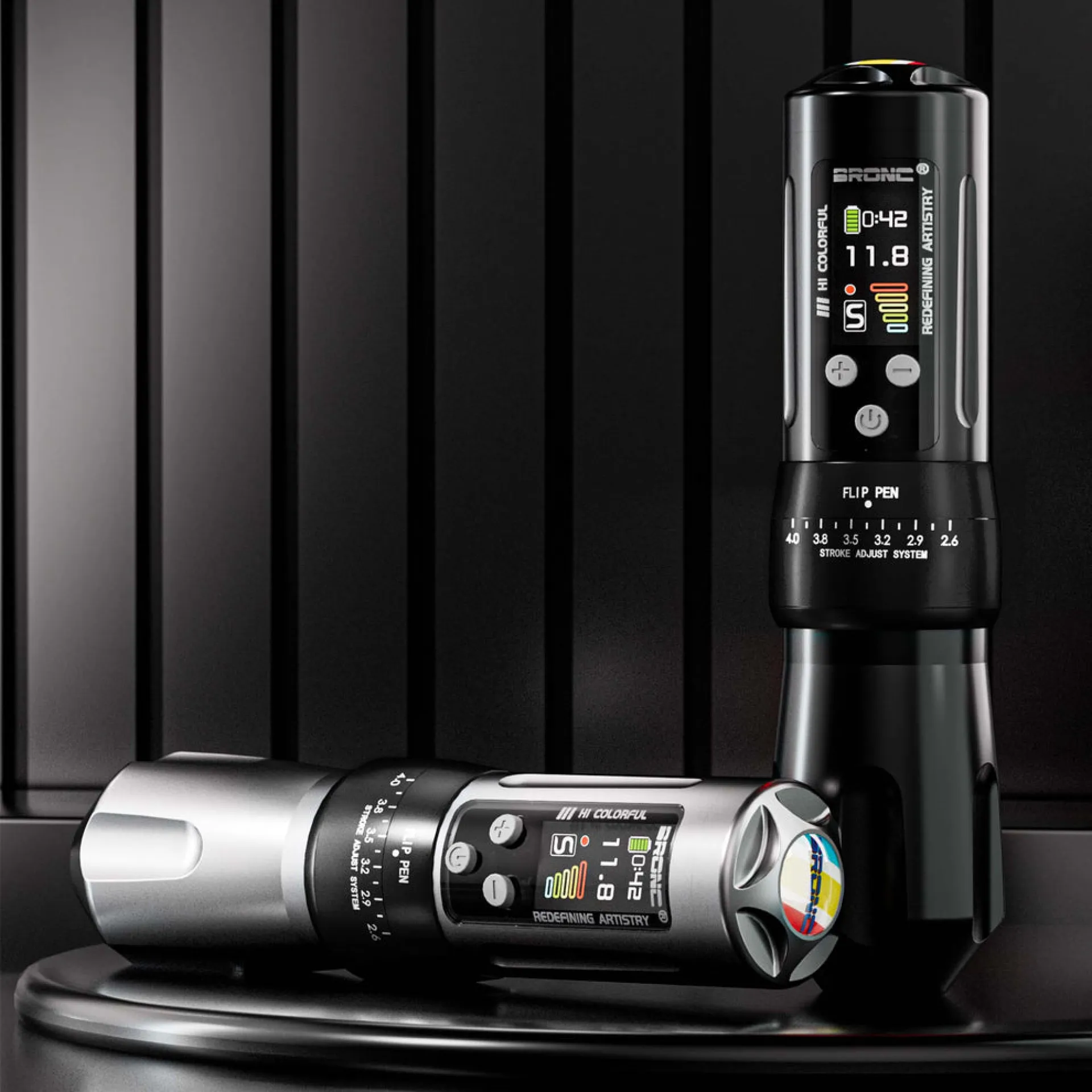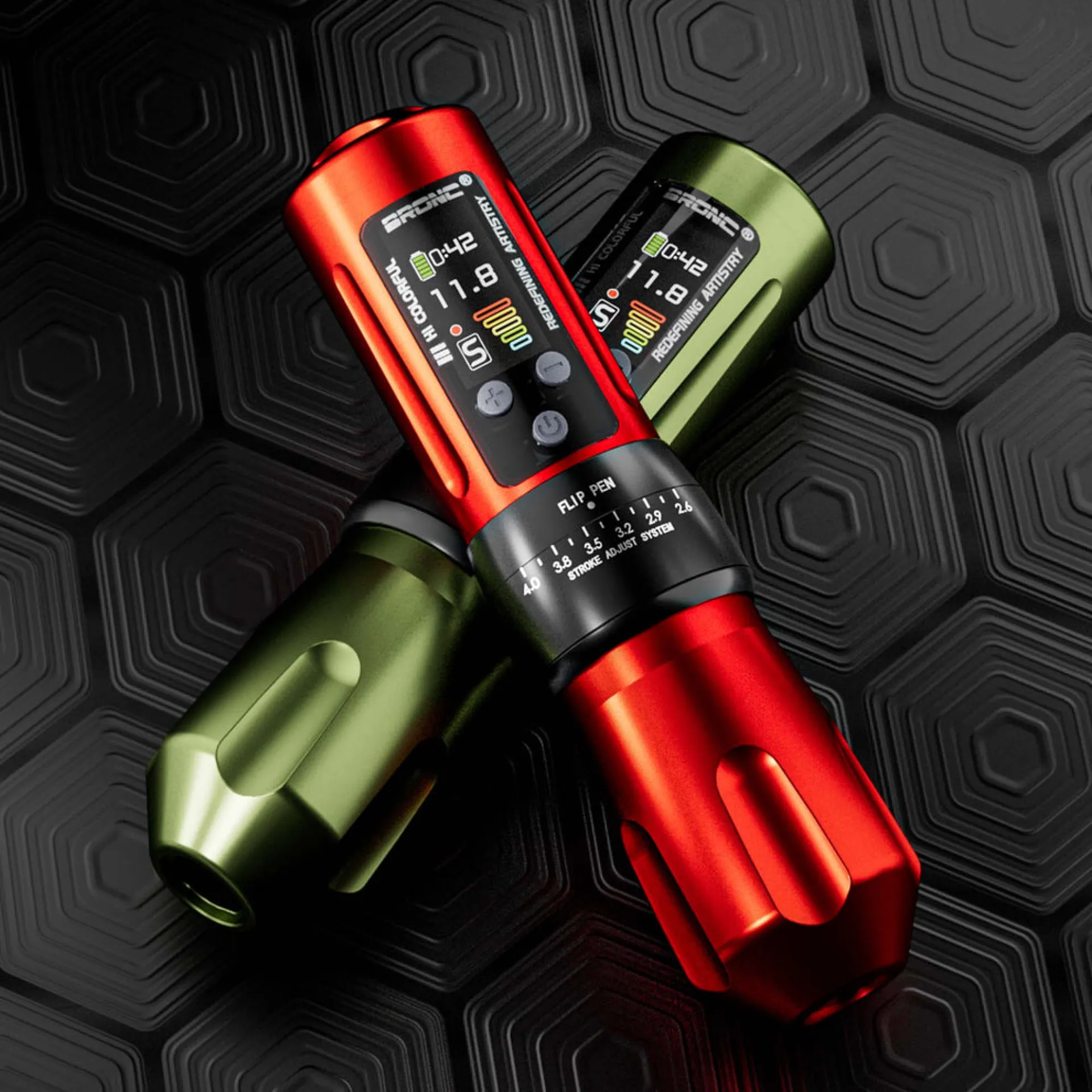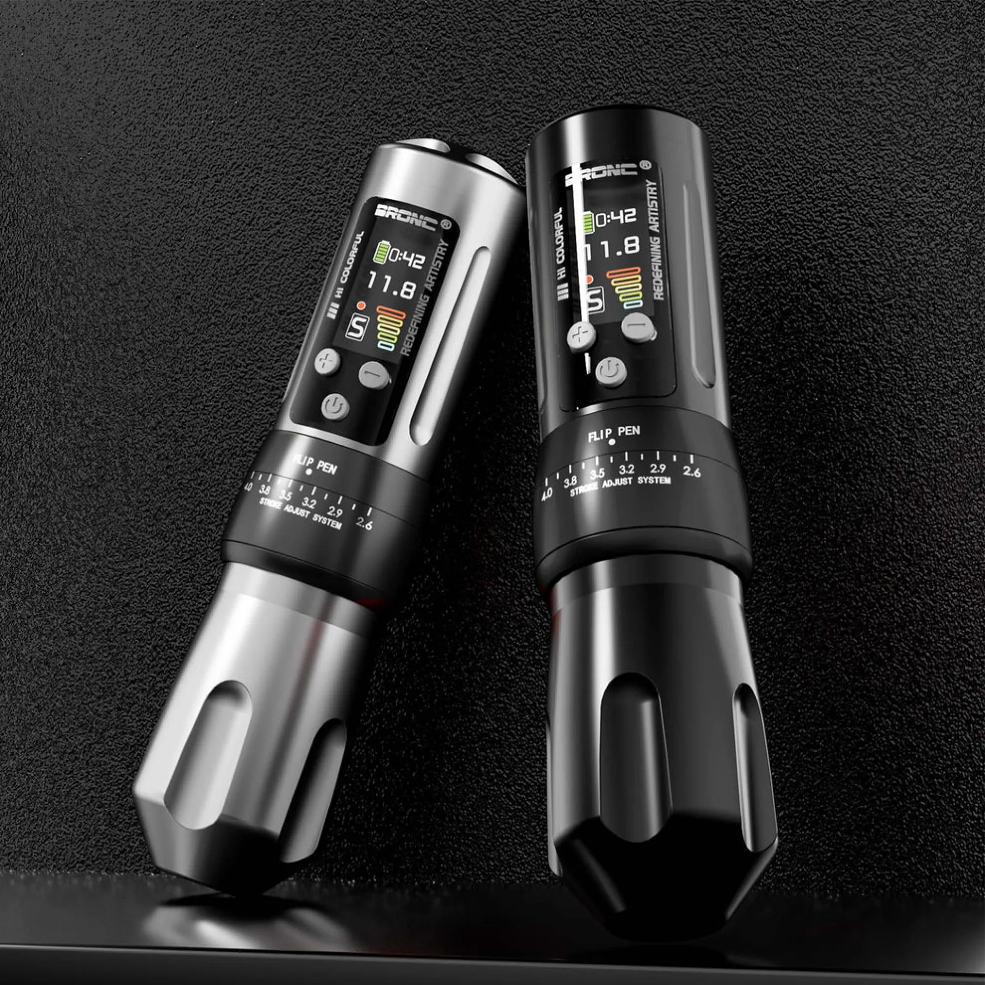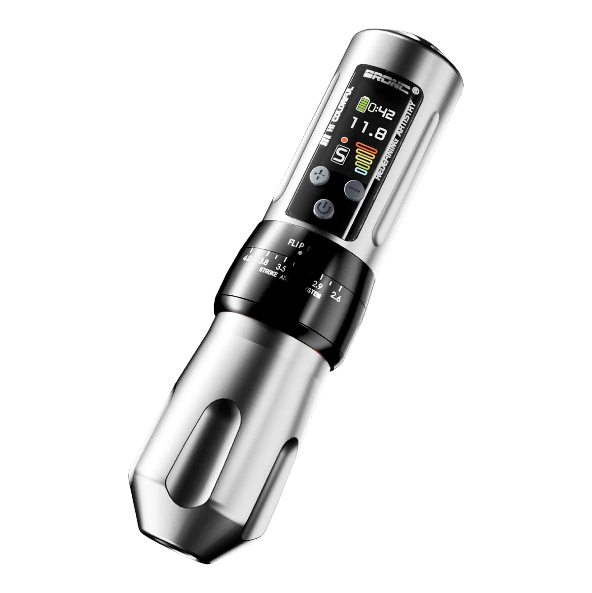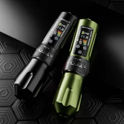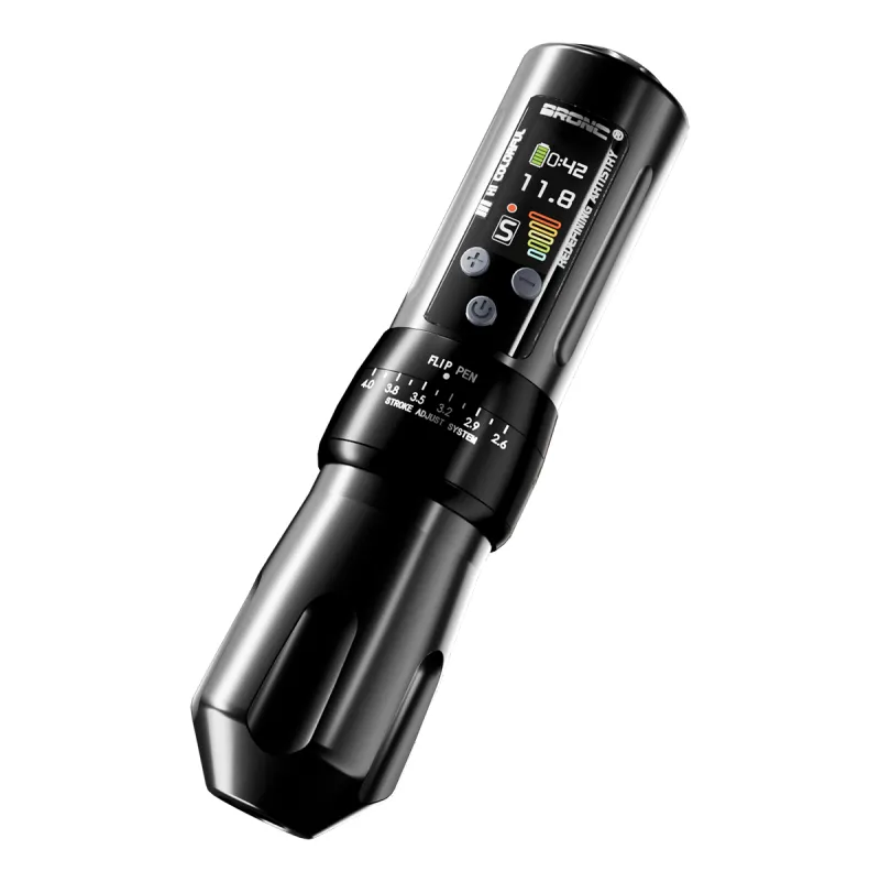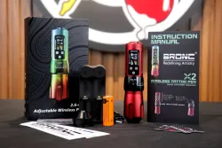 Регулируемата безжична машина от Hummingbird Tattoo е надежден избор както за професионалисти, така и за начинаещи, търсещи прецизност и комфорт. В сравнение с X1, BRONC X2 има голям цветен IPS дисплей с висока резолюция и ъгъл на видимост от 180°, който също така е защитен с 6-то поколение закалено стъкло Corning 3D за устойчивост против надраскване. На дисплея има възможност за настройка на 4 нива на напрежение според различните нужди, оформление на дисплея, яркост и таймер. Машината се предлага с две батерии, които ще осигурят 15-20 часа непрекъсната работа. BRONC X2 има ергономичен дизайн на ръкохватката с възможност за регулиране на удължението на иглата от 0 до 4,5 мм. Машината има и възможността да променя хода на мотора от 2,6 до 4 мм, което ще отговори на изискванията на всеки стил.