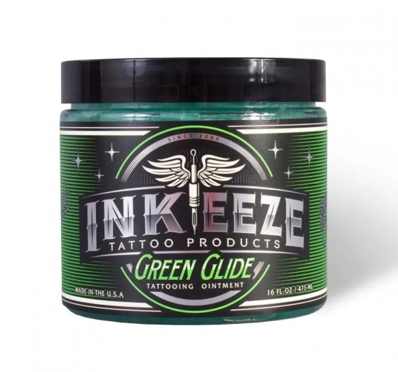 INK-EEZE е първокласна козметика за татуировки, произведена в САЩ и използвана от известни художници като Роман Абрего, Доминик Васкес и Mr. Scary. Green Tattoo Glide е специално разработен универсален крем за татуировки. Може да се използва по време на татуиране като заместител на вазелина и като крем за последваща грижа за заздравяване на нова татуировка. Съдържа екстракт от лавандула, женско биле, зелен чай и нар. Има лек ментолов аромат и приятно успокоява кожата по време на татуиране.