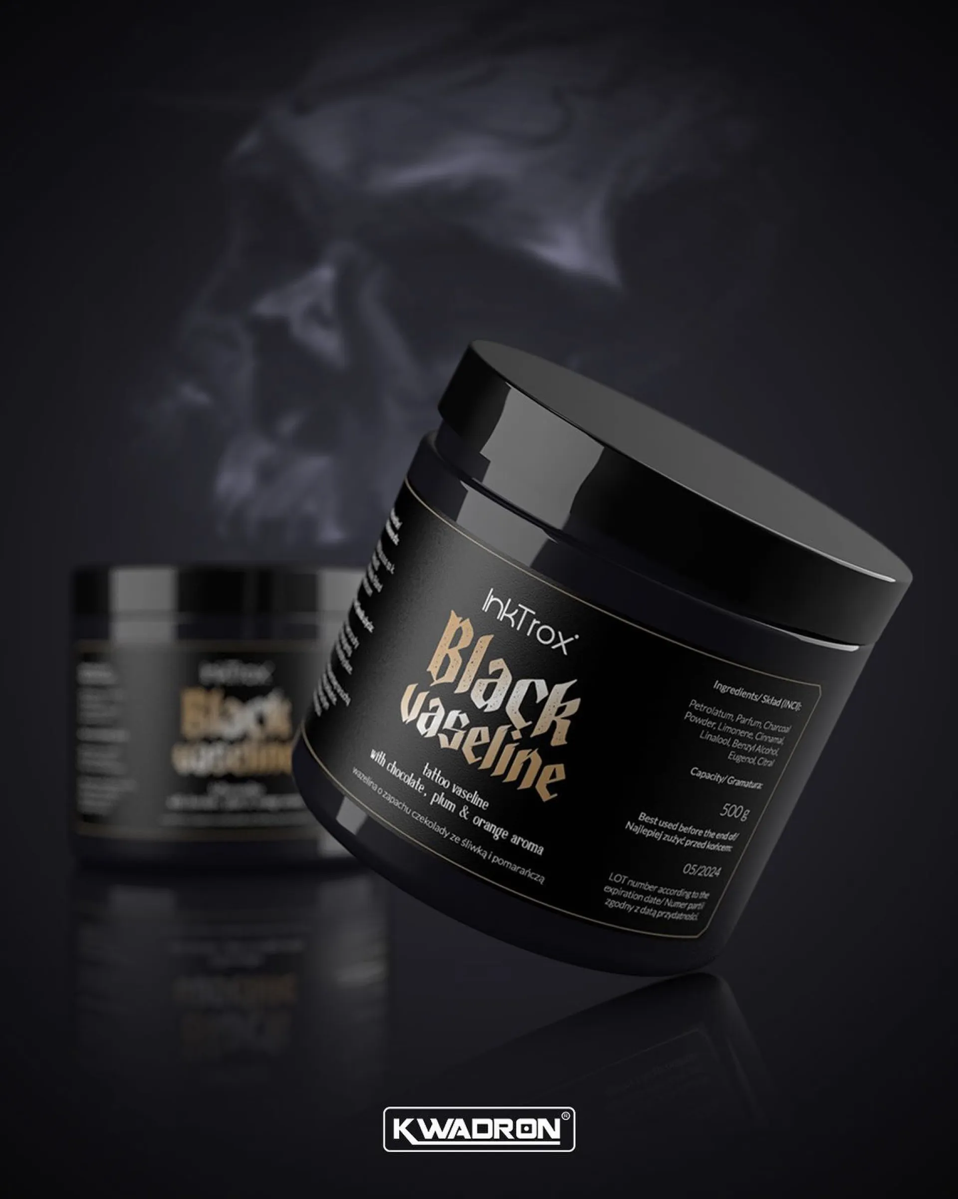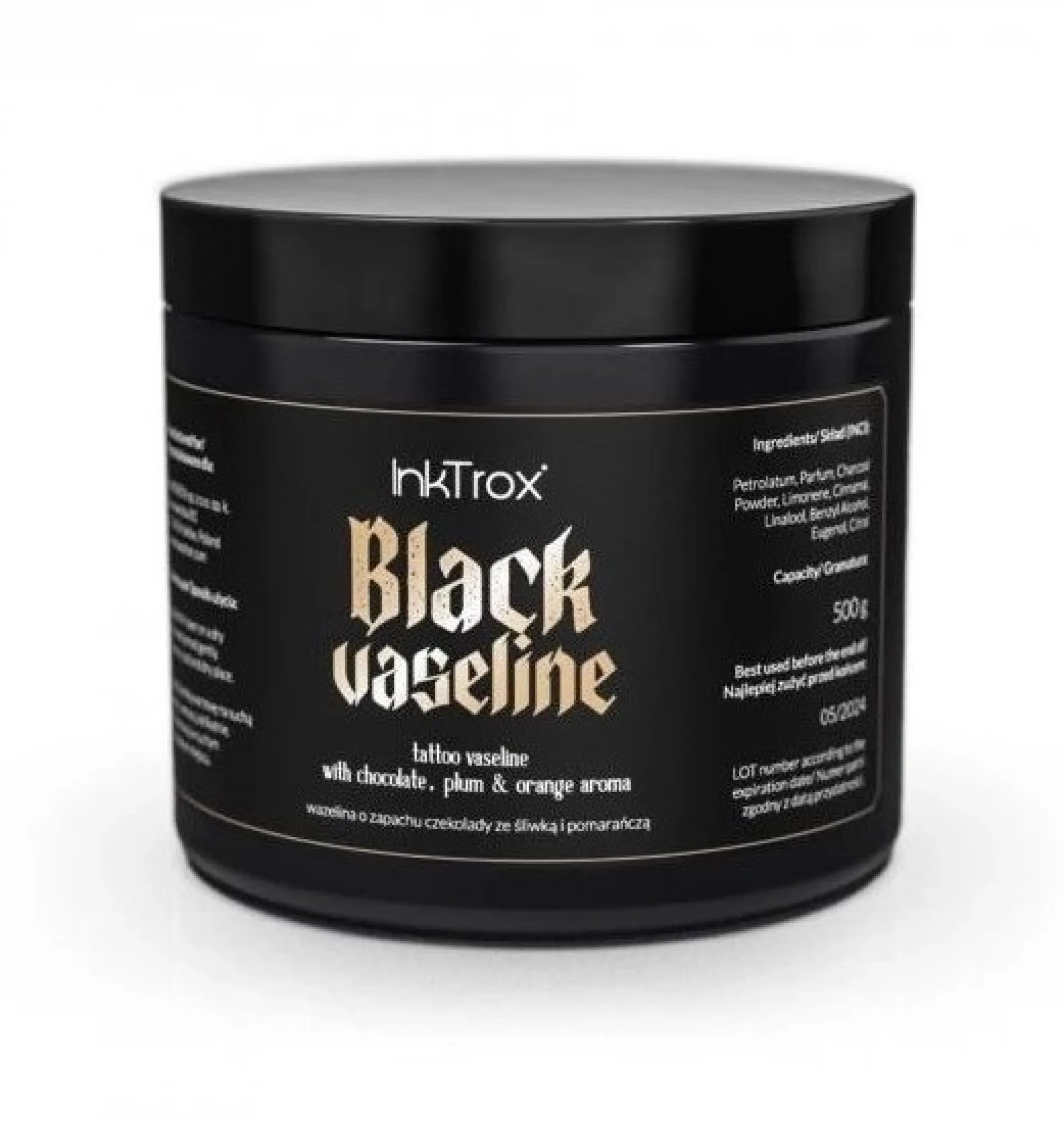 Специализиран черен козметичен вазелин с аромат на тъмен шоколад, сливи и портокали. Много ефективен и безопасен продукт за всички типове кожа. Това улеснява процедурата по татуиране и е чудесно за ежедневна грижа за кожата. Предлага се в опаковки от 500 г.