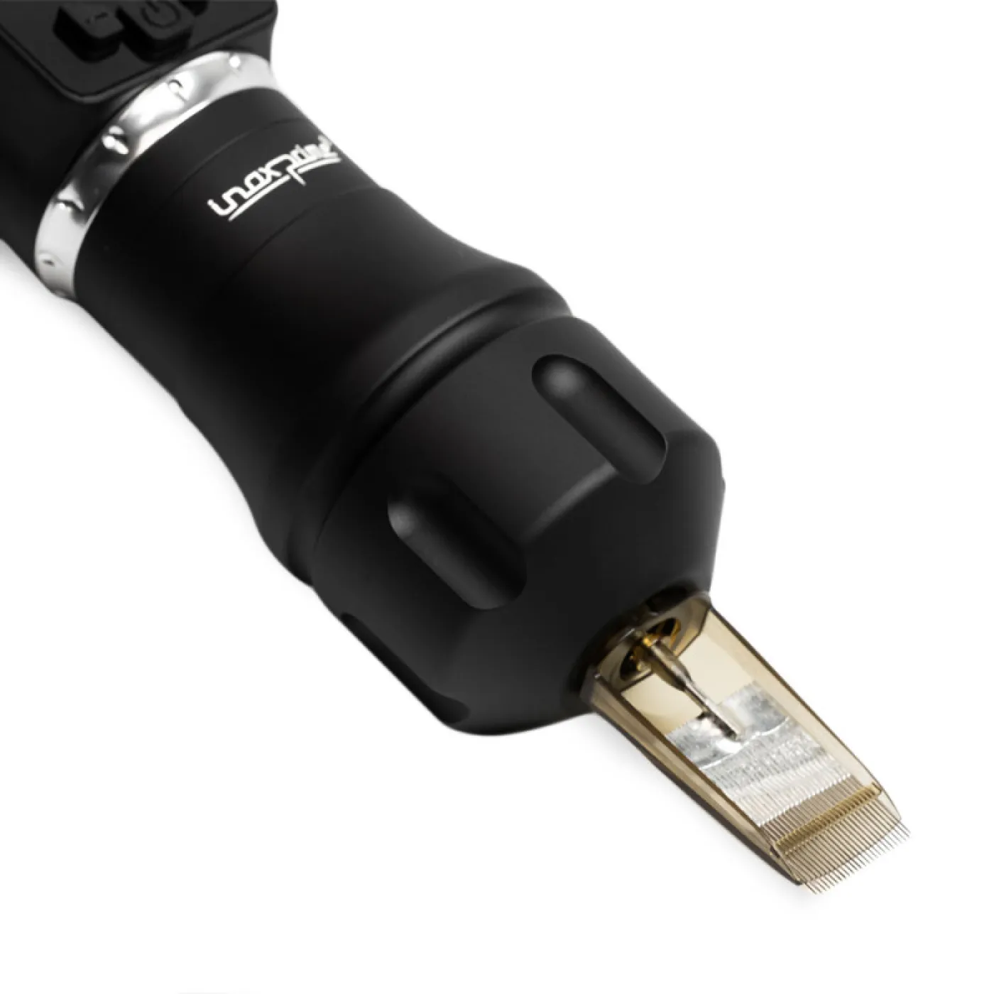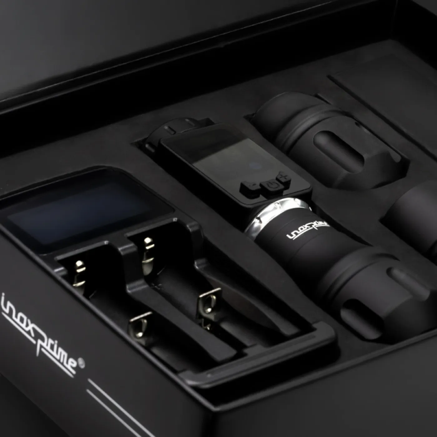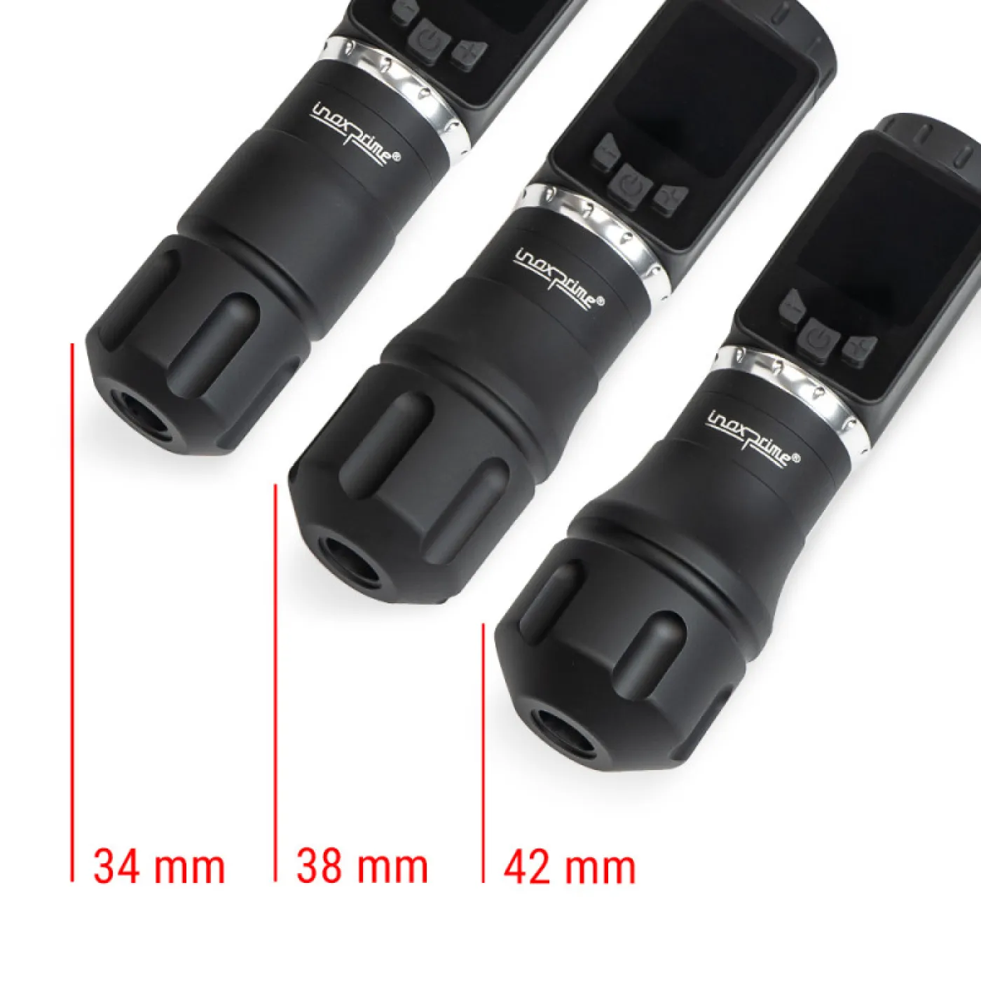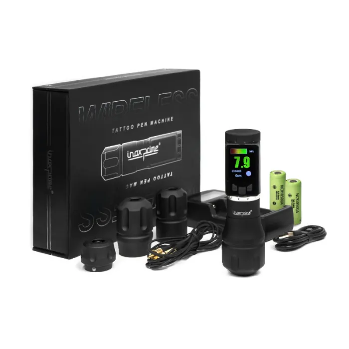 Inox Prime от Kwadron с ход от 4,2 мм е висококачествена безжична машина за татуировки, която работи безжично до 8 часа. Подходящ е не само за професионалисти, които търсят иновации и са в крак с пазарните тенденции. Разполага с голям, лесен за четене дисплей, който позволява прецизно наблюдение на параметри като честота, напрежение и други настройки. Комплектът включва 3 различни размера ергономични дръжки, което ви позволява да персонализирате тримера според вашите предпочитания. Друго предимство е възможността за свързване на RCA кабел чрез включения адаптер.