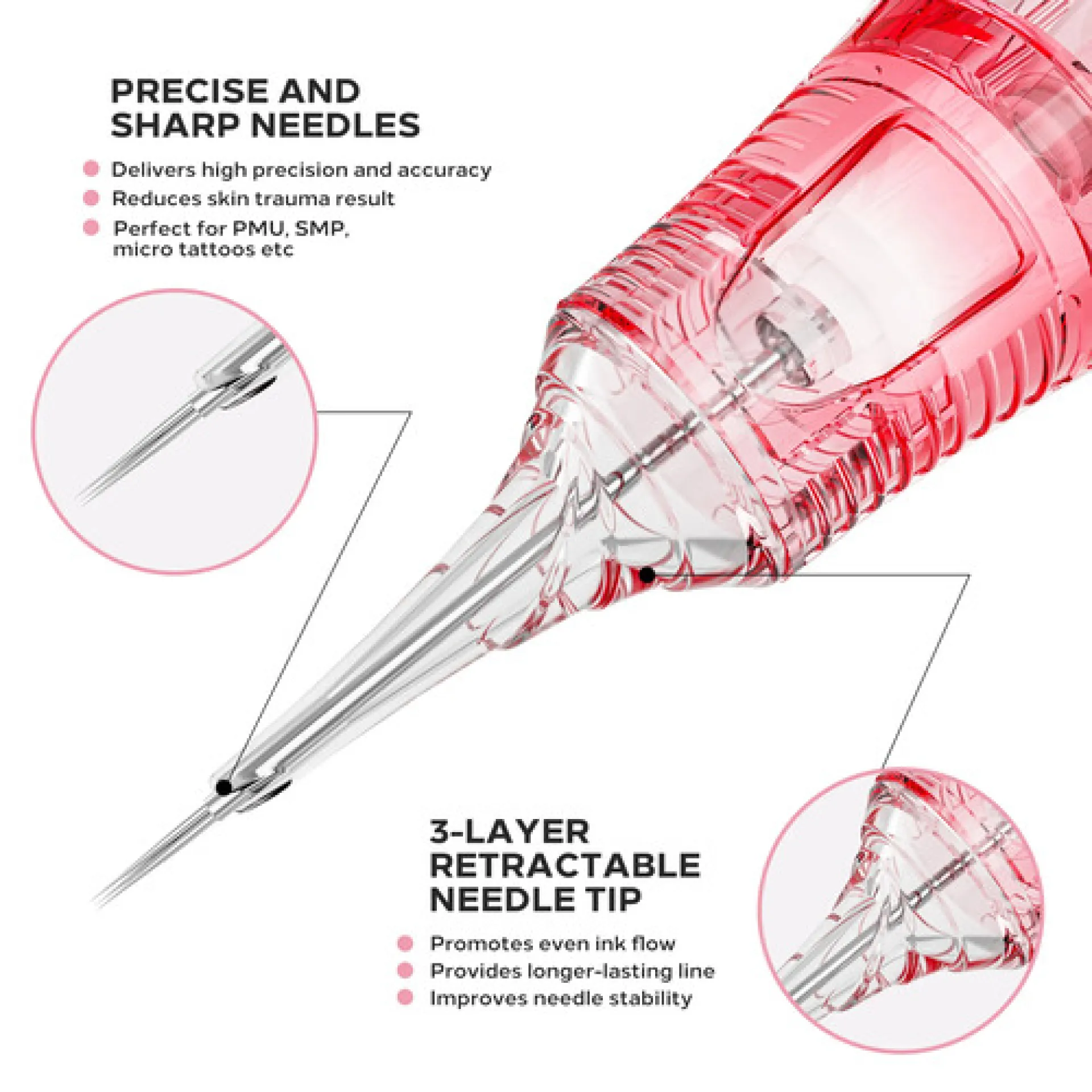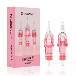 JCONLY VETAR S PMU са професионални картридж игли, изработени от висококачествена японска стомана, монтирани в прецизна отливка от фармацевтичен пластмасов материал от най-висок клас. Иглите се подреждат ръчно, а мембраната не позволява обратно връщане на боя или вода в машинката. Освен това, при мембраната е използван мек силикон, който осигурява по-плавна работа на машината в сравнение с обикновената гума и намалява съпротивлението на мотора, като по този начин удължава неговия живот.