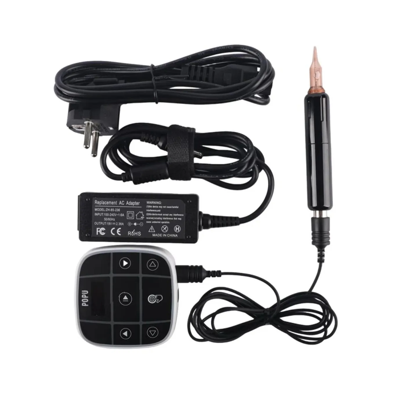 Комплектът POPU HALO V2 предлага цялостно решение за професионална работа в PMU и SMP. В комплекта са включени захранващ блок HALO V2 с интуитивно управление и ясен LCD дисплей, ултралеката машинка TH014 с тих японски мотор, която пасва удобно и в по-малка ръка, както и захранващи кабели с адаптер.