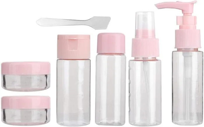 Комплект флакони за пътуване в кутия с възможност за многократно затваряне. Вземете само необходимото количество от любимата си козметика и спестете място в багажа си. Този комплект за пътуване отговаря на критериите за багаж за самолет. Комплектът включва 3 прозрачни бутилки и един пулверизатор.