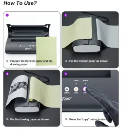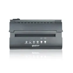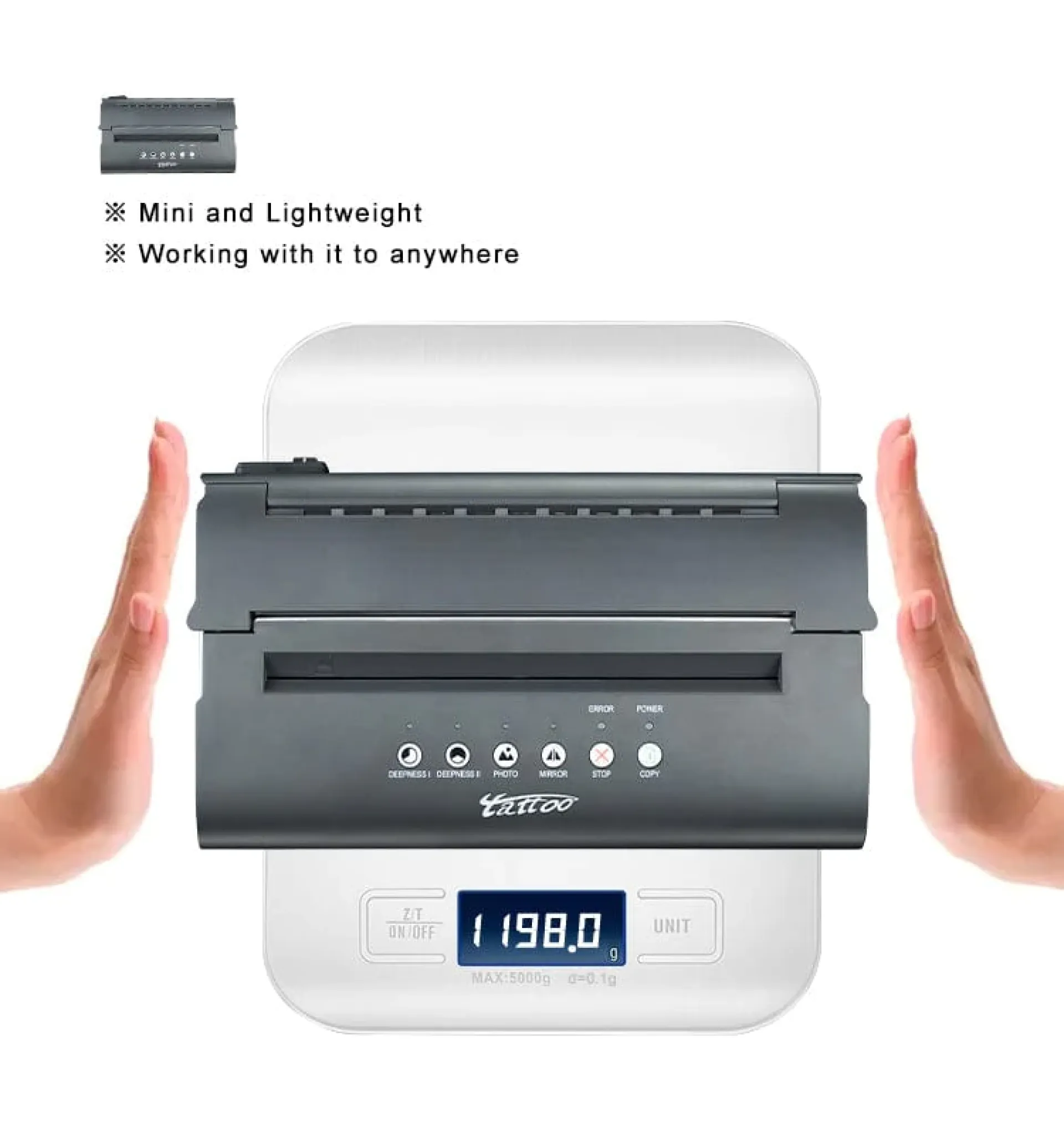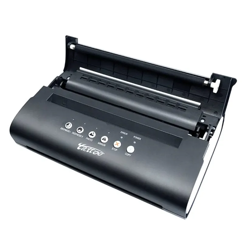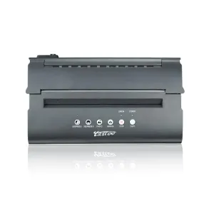Този лек и надежден копир за татуировки ще улесни работата ви и ще замени досадното ръчно прерисуване. Няма нужда да купувате мастило или други консумативи за принтера, освен термохартия. Просто поставете предварително нарисувания мотив между термохартията и натиснете бутона. Копирната машина ще се погрижи за всичко останало бързо, без шум или прекомерно прегряване. Прехвърленият мотив върху термохартията може след това да бъде отпечатан върху кожата.