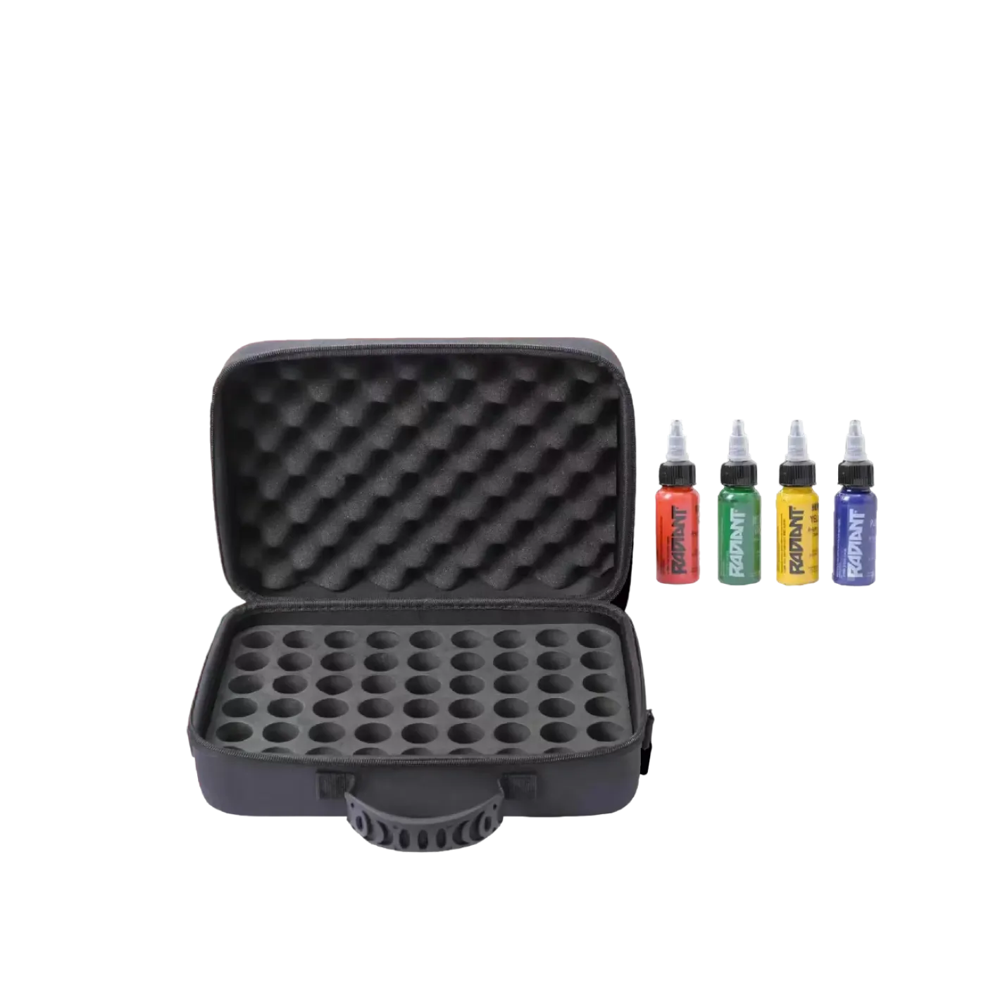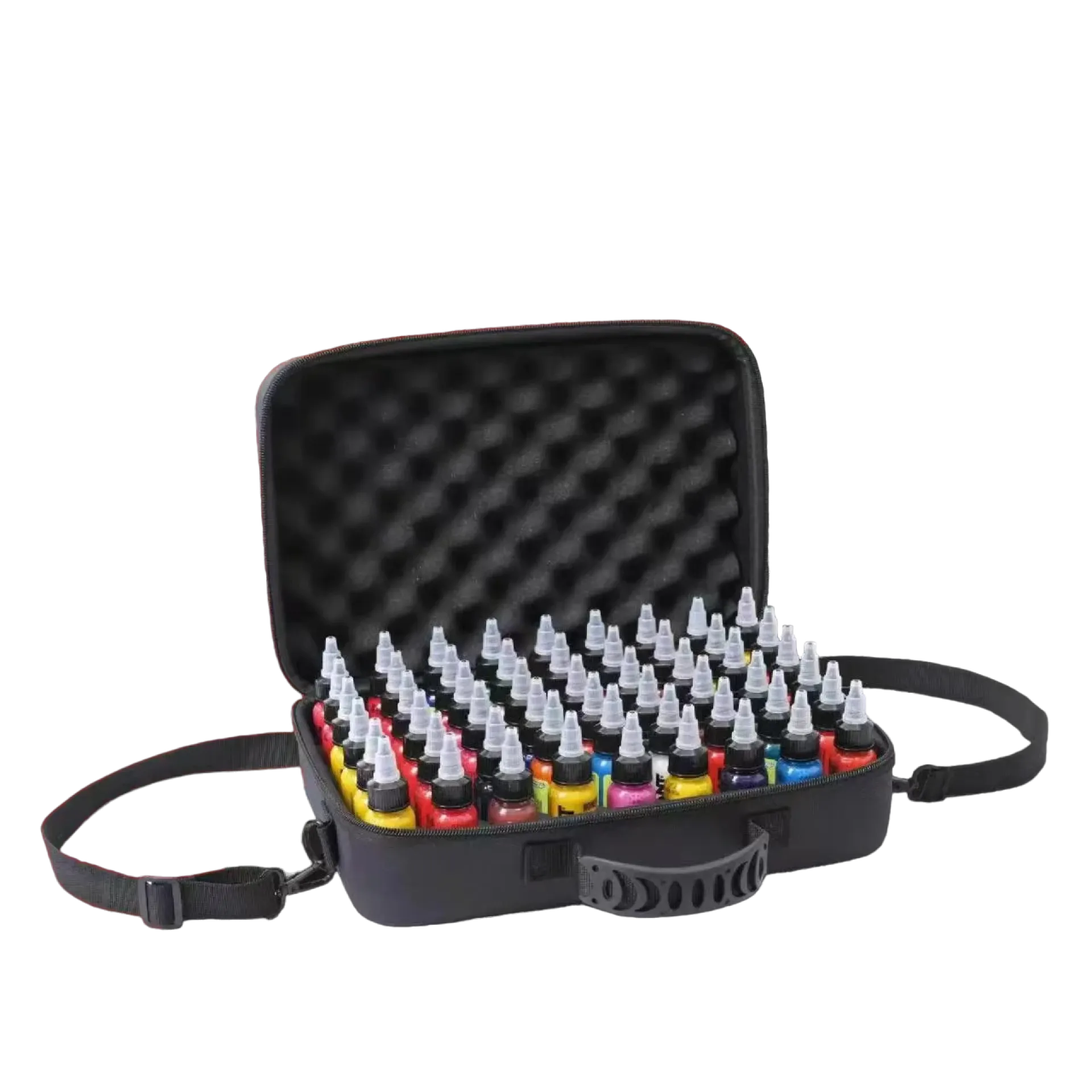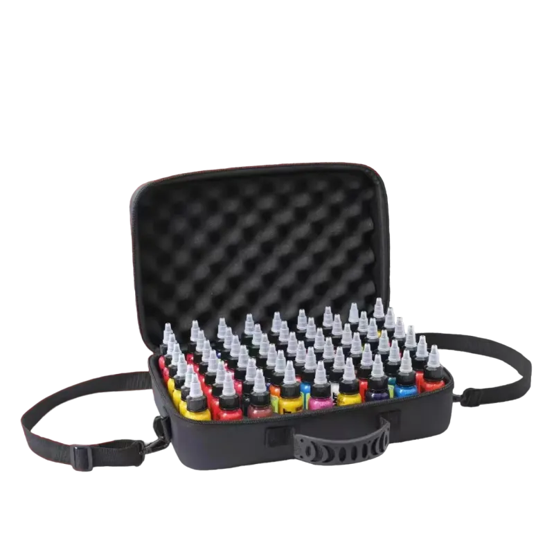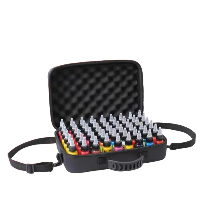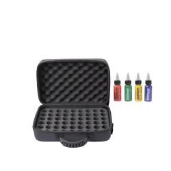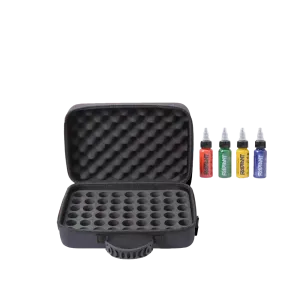 Кутията за съхранение на мастило за татуировки, която може да съхранява до 54 цвята в обем от 30 мл, е идеалното решение за татуисти, които пътуват често и работят с обширни комплекти мастила. Този практичен водоустойчив калъф е проектиран да осигури удобно съхранение и защита за широка гама от мастила за татуировки. Кутията включва водоустойчива мемори пяна с изрези за боя, защитна „обвивка“ от мемори пяна, която поставяте върху подредените бои, и регулируема дръжка.