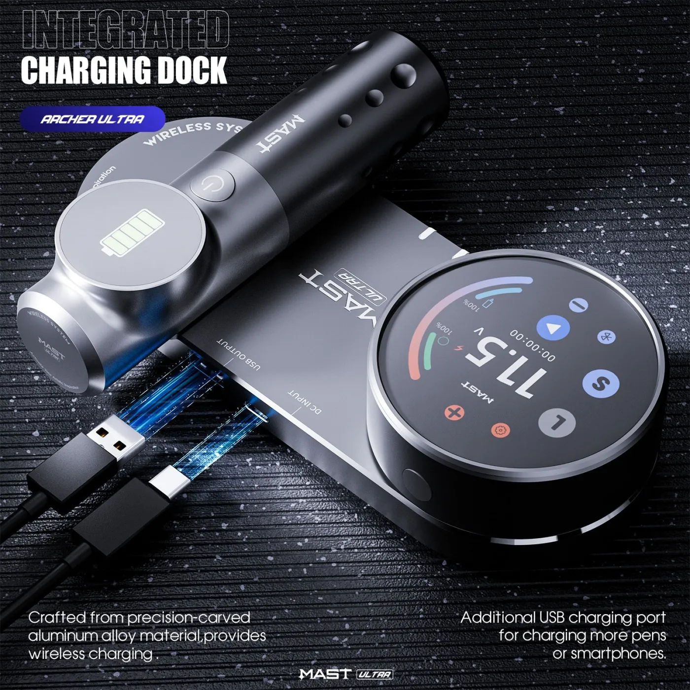 MAST Archer Ultra Smart предлага бърза и интелигентна безжична връзка чрез технологията MAST Bluetooth с батерия, която може да се прикрепи чрез магнит към безжична докинг станция. Докинг станцията позволява едновременно безжично зареждане както на батерията, така и на машинката. И източникът, и батерията на машинката са оборудвани с голям тъч дисплей, който показва текущото напрежение, нивото на батерията и работното време. Освен това има допълнителен USB порт за зареждане на други pen машинки или смартфони.