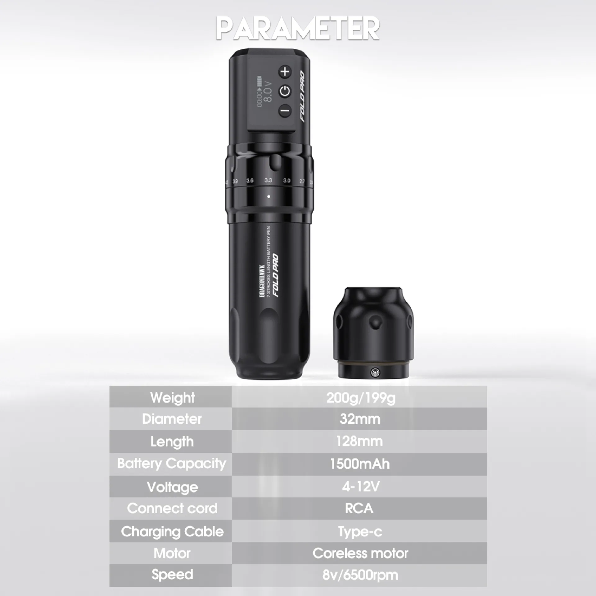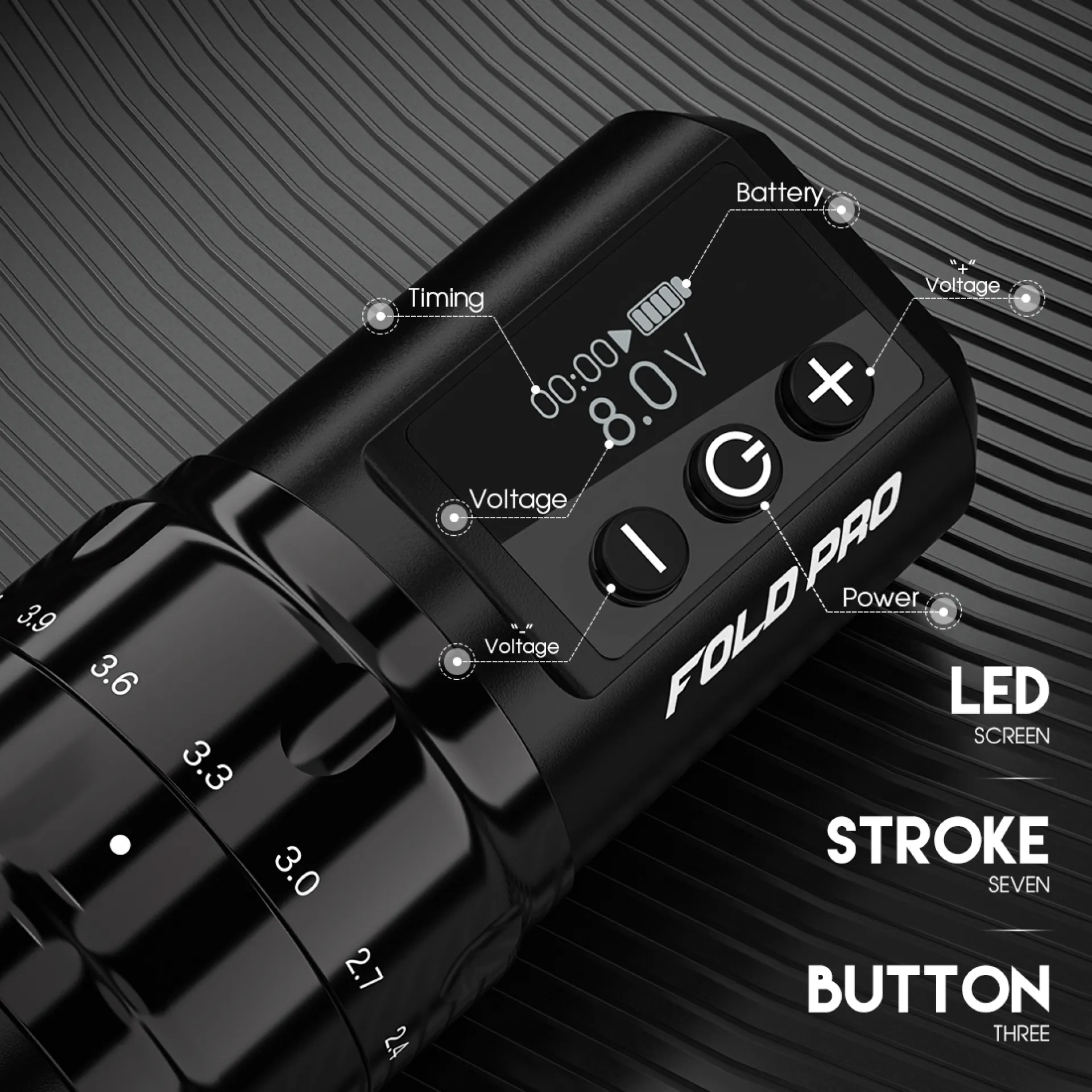 Безжичният модел FOLD PRO предлага до 7 различни хода на иглата, което позволява прецизно настройване според предпочитанията и стила на работа. Машината разполага с батерия с висок капацитет (1500 mAh), осигуряваща 4–6 часа работа в зависимост от използваното напрежение и размер на иглата. След като батерията се изтощи, тя може да бъде сменена с RCA конектор и да работи с обикновен източник на захранване за татуировки. Батерията има LED дисплей, който показва нивото на зареждане на батерията, времето за работа и избраното напрежение. За промяна на напрежението се използват механични бутони, които са достъпни дори когато машината е увита във фолио.